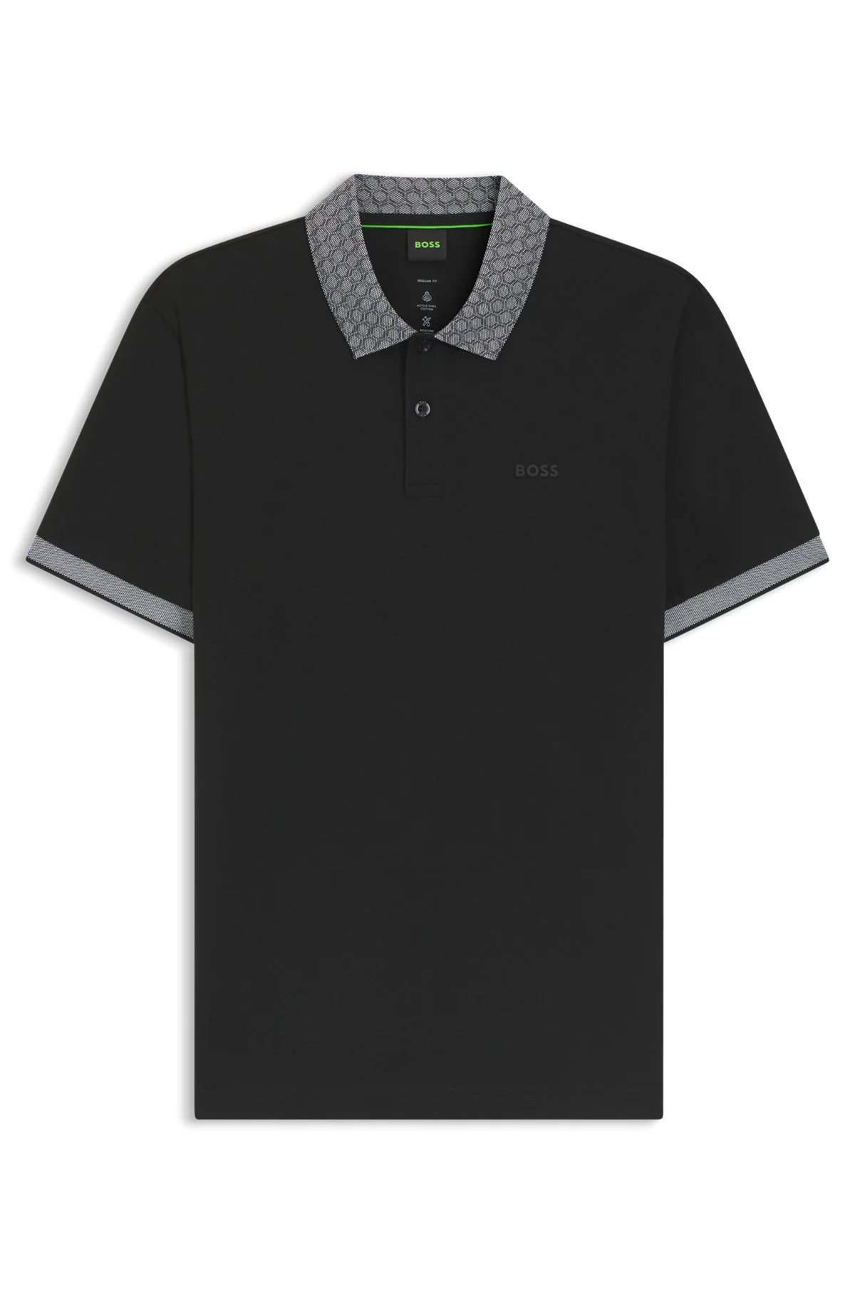 SIZE AND FIT The model wears a size M and is 6'2" tall with a, 38" chest, 30" waist and 37" hips. DETAILS With a hexagonal-printed collar, this regular-fit BOSS Menswear polo shirt is a sporty must. Quick-dry stretch-cotton pique for easy movement. Regular fit Neckline: Flat-knit collar Number of buttons: 2 Short sleeves Flat-knit cuffs Standard length PL_GOC Chip Paddy - 50554583 QUALITY & CARE INSTRUCTIONS Do Not Bleach Do Not Tumble Dry Iron Low Heat Do Not Dry Clean Machine Wash Cold Gentle Material: 92% Cotton, 8% Elastane