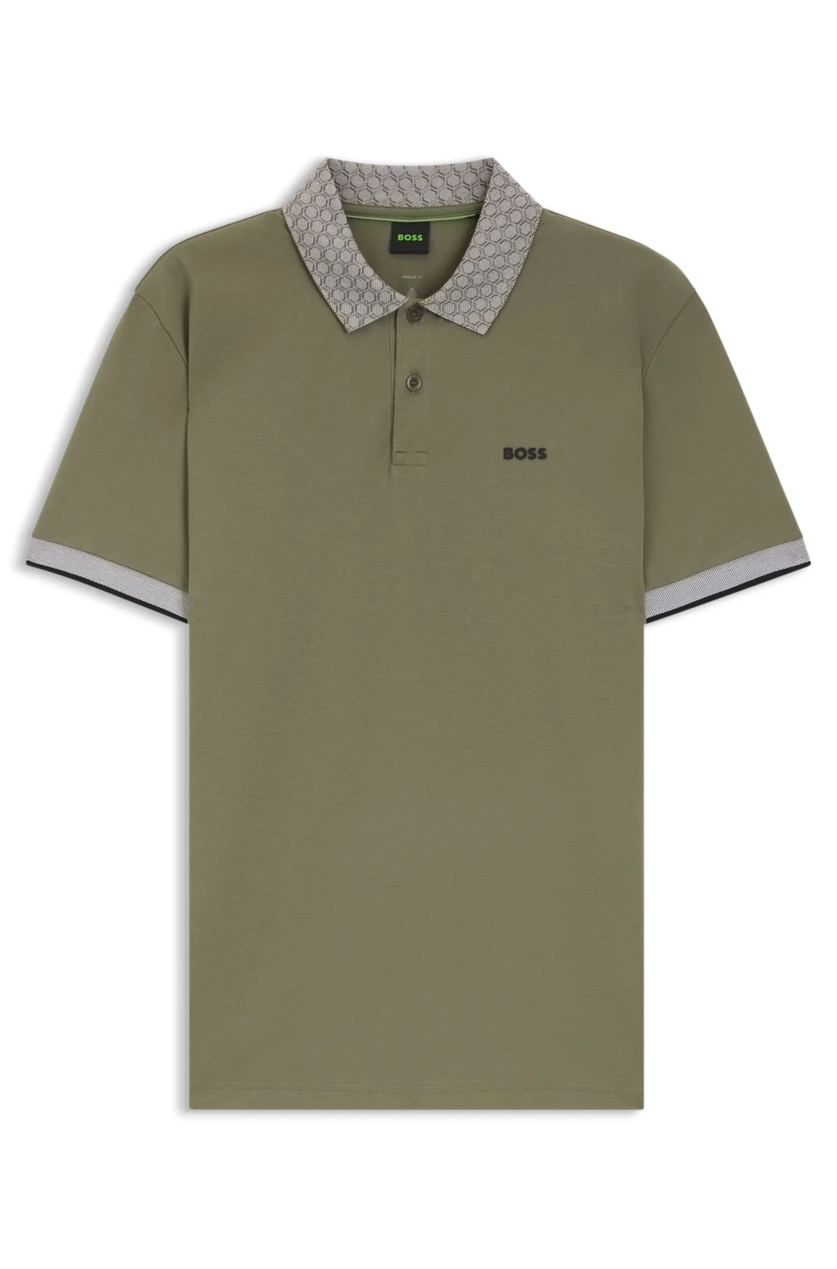 SIZE AND FIT The model wears a size M and is 6'2" tall with a, 38" chest, 29" waist and 38" hips. DETAILS With a hexagonal-printed collar, this regular-fit BOSS Menswear polo shirt is a sporty must. Quick-dry stretch-cotton pique for easy movement. Regular fit Neckline: Flat-knit collar Number of buttons: 2 Short sleeves Flat-knit cuffs Standard length PL_GOC Chip Paddy - 50554583 QUALITY & CARE INSTRUCTIONS Do Not Bleach Do Not Tumble Dry Iron Low Heat Do Not Dry Clean Machine Wash Cold Gentle Material: 92% Cotton, 8% Elastane