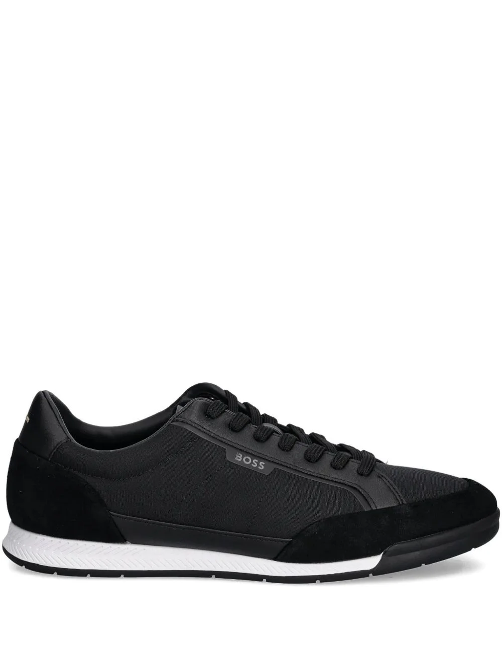 panelled lace-up low-top sneakers Highlights - Black - Lace-up fastening - Panelling - Flat sole - Round toe - Low-top design Imported Composition Outer: Polyester 100%, Calf Leather 100% Lining: Polyester 100% Sole: Rubber 100%
