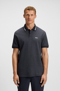 SIZE AND FIT The model wears a size M and is 6'2" tall with a, 37" chest, 29" waist and 37" hips. DETAILS Paddy Tape JQ - 50533249 A polo shirt by BOSS Menswear, detailed with a striped collar and mini-jacquard pattern. This pure-cotton top is cut to a regular fit. Regular fit Neckline: Flat-knit collar Short sleeves Flat-knit cuffs Standard length QUALITY & CARE INSTRUCTIONS Do Not Bleach Do Not Tumble Dry Quality: 100% Cotton Do Not Dry Clean Iron Low Heat Machine Wash Cold Gentle