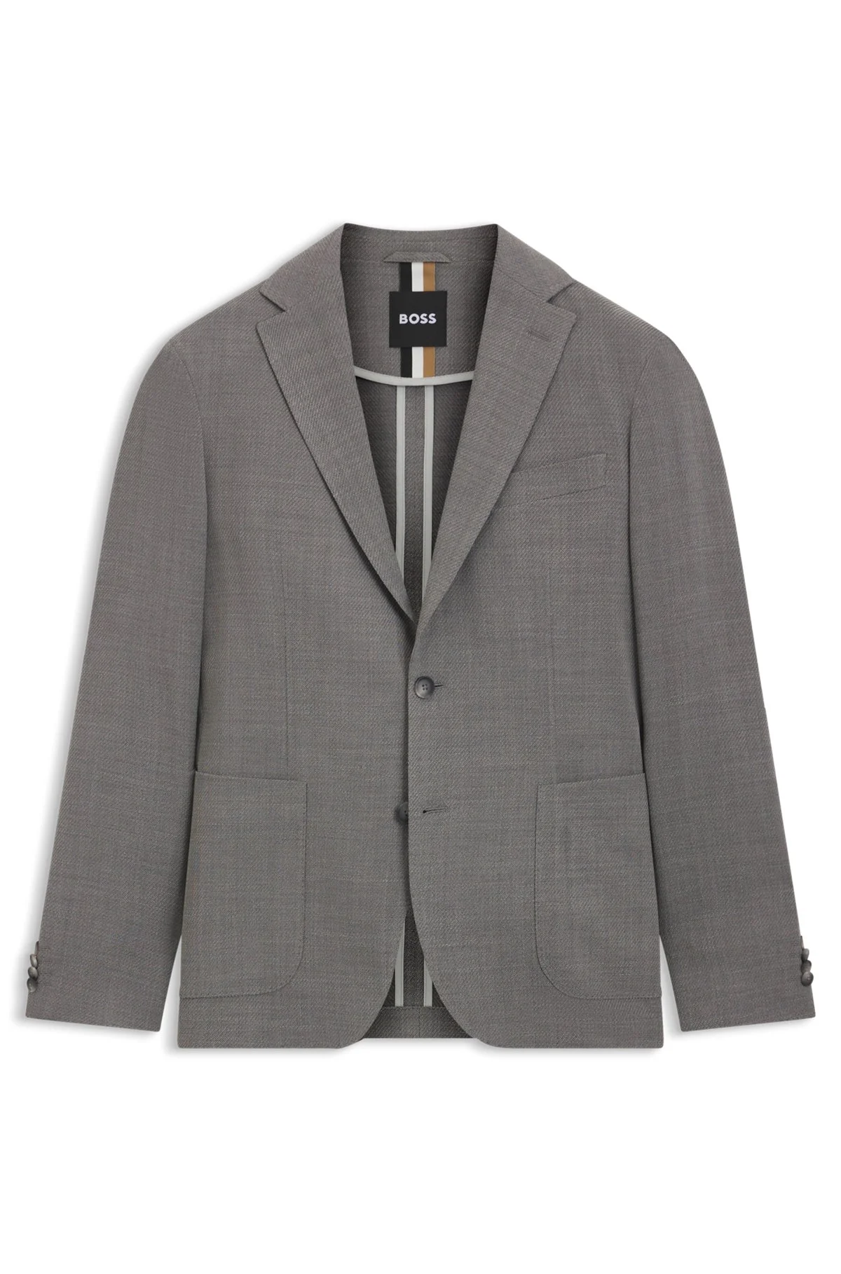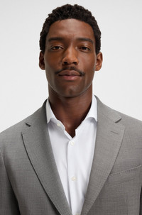 SIZE AND FIT The model wears a size 40R and is 6'1" tall with a, 36" chest, 29" waist and 37" hips. DETAILS With a soft shoulder construction, this slim-fit BOSS Menswear blazer is a great all-rounder. Blended with wool, cotton and stretch. Subtle pattern. Slim fit Notched lapels Fastening top: Button closure Number of buttons: 2 Welt chest pockets Pockets top: Flap pockets Kissing buttons on the cuff Partially lined C-Hanry-252 - 50545830 QUALITY & CARE INSTRUCTIONS Do Not Tumble Dry Do Not Wash Do Not Bleach Iron Low Heat Reduced Dry Clean Material: 26% Viscose, 46% Virgin wool, 26% Cotton, 2% Elastane, Lining: 65% Polyester, 35% Cotton, Sleeve lining: 100% Viscose, pocketing: 100% Cotton