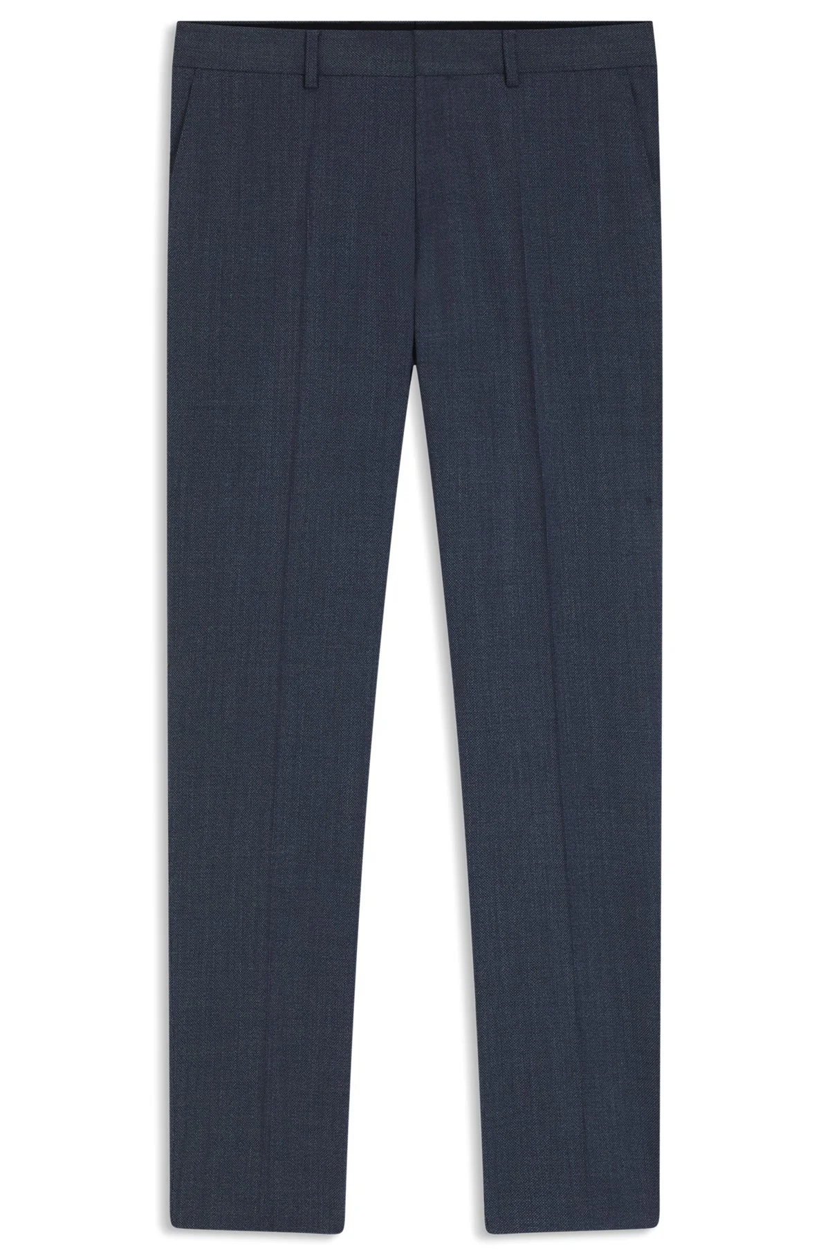 SIZE AND FIT The model wears a size 32R and is 6'1" tall with a, 36" chest, 29" waist and 36" hips. DETAILS Designed in virgin wool with added stretch for flexibility, these subtly patterned BOSS Menswear trousers are easy to style. Cut to a slim fit. Slim fit Hook and zip closure Pleat front Pockets bottom front: Side slash pockets Pockets bottom back: Welt pocket Partially lined H-Genius-253 - 50564107 QUALITY & CARE INSTRUCTIONS Material: 99% Virgin wool, 1% Elastane, pocketing: 65% Polyester, 35% Cotton, knee lining: 100% Viscose Do Not Bleach Do Not Tumble Dry Reduced Dry Clean Iron Low Heat Do Not Wash