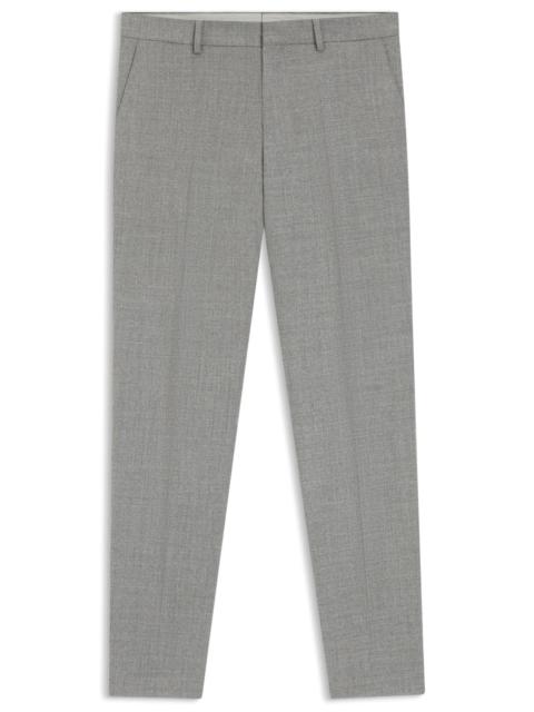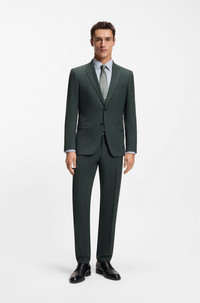 SIZE AND FIT The model wears a size 32R and is 6'1" tall with a, 37" chest, 29" waist and 35" hips. DETAILS Designed in virgin wool with added stretch for flexibility, these subtly patterned BOSS Menswear trousers are easy to style. Cut to a slim fit. Slim fit Hook and zip closure Pleat front Pockets bottom front: Side slash pockets Pockets bottom back: Welt pocket Partially lined H-Genius-253 - 50564107 QUALITY & CARE INSTRUCTIONS Do Not Tumble Dry Do Not Wash Iron Low Heat Reduced Dry Clean Do Not Bleach Material: 99% Virgin wool, 1% Elastane, pocketing: 65% Polyester, 35% Cotton, knee lining: 100% Viscose