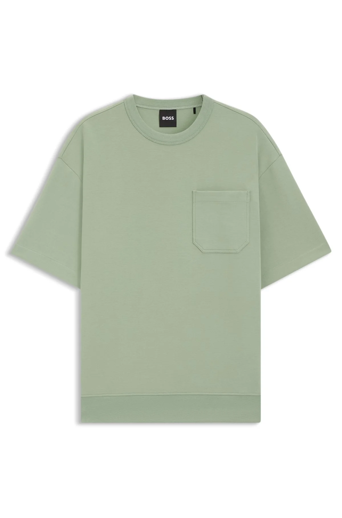 SIZE AND FIT The model wears a size M and is 6'2" tall with a, 35" chest, 29" waist and 35" hips. DETAILS Offering elevated casual comfort, this BOSS Menswear T-shirt is cut in a stretchy cotton with a soft peached finish. Straight fit with chest pocket. Regular fit Neckline: Crew neck Short sleeves Standard length C-Tames 32 - 50554243 QUALITY & CARE INSTRUCTIONS Material: 74% Cotton, 21% Polyamid, 5% Elastane, Waistband: 98% Cotton, 2% Elastane Dry Clean Only Iron Low Heat Do Not Tumble Dry Do Not Bleach Cold, gentle machine wash; reduced spin speed.