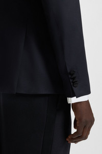 SIZE AND FIT The model wears a size 38R and is 6'1" tall with a, 35" chest, 30" waist and 35" hips. DETAILS H-Huge-Tux-P-B1 - 50469170 A tuxedo jacket in a defined fit, by BOSS Menswear. Crafted in serge-woven wool, this elegant piece features tonal silk-blend trims. Slim fit Peaked lapels Number of buttons: 2 Welt chest pockets Pockets top: Flap pockets Kissing buttons on the cuff Side vent Fully lined QUALITY & CARE INSTRUCTIONS Iron Low Heat Do Not Wash Quality: 100% Virgin wool, Lining: 65% Viscose, 35% Polyester, Facing: 78% Silk, 22% Polyester, Sleeve lining: 100% Viscose, pocketing: 100% Cotton Reduced Dry Clean Do Not Bleach Do Not Tumble Dry
