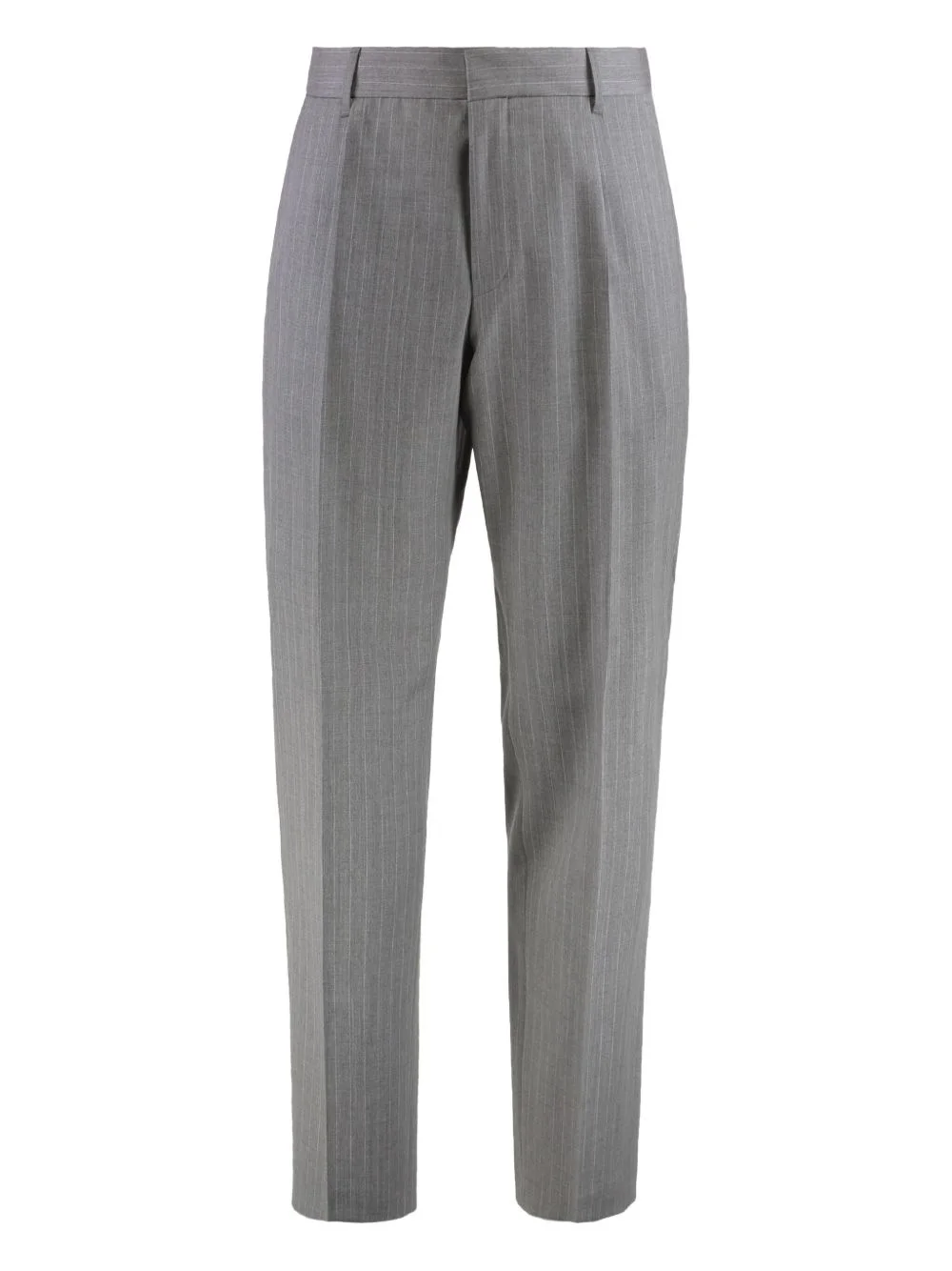 pinstripe tailored trousers Highlights - Light grey - Pinstripe pattern - Concealed front fastening - Dart detailing - Side pockets - Tailored design - Belt loops Imported Composition Lining: Polyester 65%, Cotton 35% Outer: Virgin Wool 100%