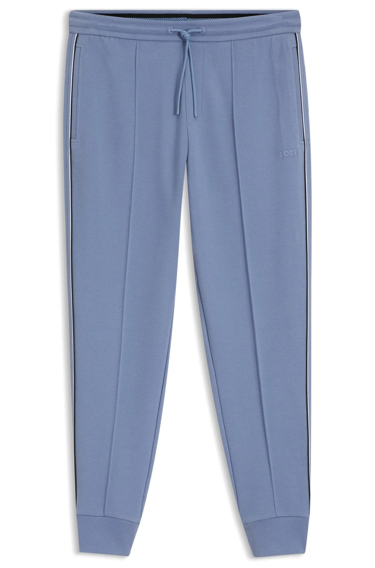 SIZE AND FIT The model wears a size M and is 6'2" tall with a, 38" chest, 30" waist and 37" hips. DETAILS Cut to a straight fit in a stretchy cotton, these BOSS Menswear tracksuit bottoms are a classic casual foundation. Contrast piping. Retro-inspired stitching. Regular fit Regular rise Drawstring Pockets bottom front: Side pockets Pockets bottom back: Slant pocket JT_Join Hadiko - 50553574 QUALITY & CARE INSTRUCTIONS Reduced Dry Clean Machine Wash Cold Gentle Do Not Bleach Do Not Tumble Dry Material: 53% Cotton, 44% Polyester, 3% Elastane, pocketing: 100% Polyester, Ribbing: 95% Cotton, 5% Elastane Iron Low Heat