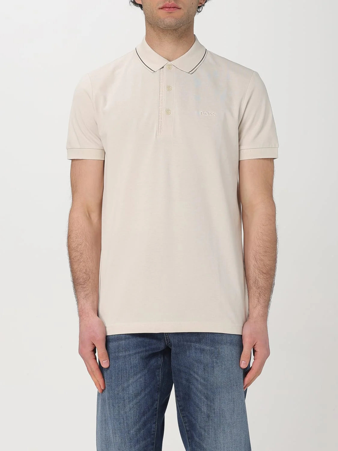 DESCRIPTION - Style: Sporty - Logo: Tone-on-tone - Details: WIth contrasting edges - Neck: Striped edges - Shoulders: Regular - Sleeves: Short - Closure: With 3-button placket - Bottom: With straight hemline - Materials: Cotton - Pattern: Plain-colored DETAILS AND CARE Composition not available SIZE AND FIT Sizes not available Size and fit Slim fit Designer code: 50506195 131 Giglio Code: G61174 Designer: Boss Collection: Boss Men Category: Clothing Boss