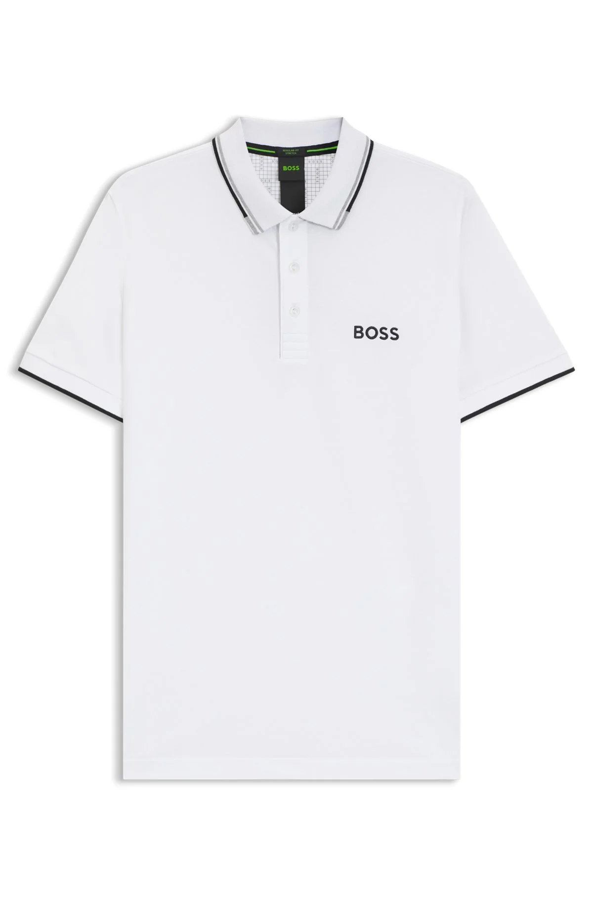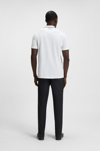 SIZE AND FIT The model wears a size M and is 6'1" tall with a, 37" chest, 29" waist and 37" hips. DETAILS Paddy Pro - 50469102 A distinctive polo shirt cut to a regular fit, by BOSS Menswear. Featuring contrast branding at the left chest and back neck, this short-sleeved polo shirt is designed in fabric with S.Cafe® and stretch for casual comfort. 3D stripes add a sporty touch at the collar and cuffs. S.Cafe® fabric is made from coffee grounds, transformed by a patented process into a special yarn. This fabric provides exceptional wearing comfort coupled with permanent performance benefits including fast drying and odor control. Regular fit Neckline: Flat-knit collar Number of buttons: 3 Short sleeves Flat-knit cuffs Standard length QUALITY & CARE INSTRUCTIONS Do Not Bleach Do Not Tumble Dry Do Not Dry Clean Iron Low Heat Quality: 56% Cotton, 39% Polyester, 5% Elastane Machine Wash Cold Gentle
