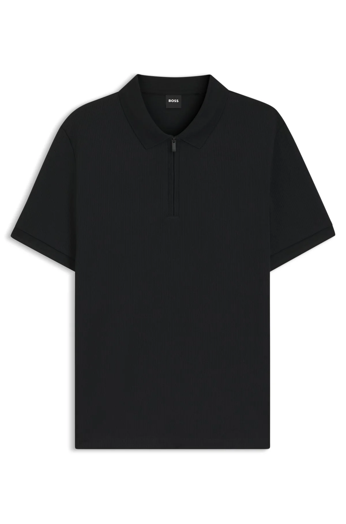 SIZE AND FIT The model wears a size M and is 6'1" tall with a, 33" chest, 24" waist and 36" hips. DETAILS P-Paras 25 - 50537494 Cut to a straight fit, this BOSS Menswear polo shirt is a new-season must. Topped with a zipped placket for a clean look, this polo shirt is engineered in seersucker to create comfortable airflow in warmer temperatures. Stretch in the fabric allows for easy movement. Regular fit Neckline: Flat-knit collar Fastening top: Zip closure Flat-knit cuffs Side slit QUALITY & CARE INSTRUCTIONS Cold, gentle machine wash; reduced spin speed. Quality: 54% Cotton, 42% Polyester, 4% Elastane Do Not Tumble Dry Do Not Bleach Iron Low Heat Do Not Dry Clean