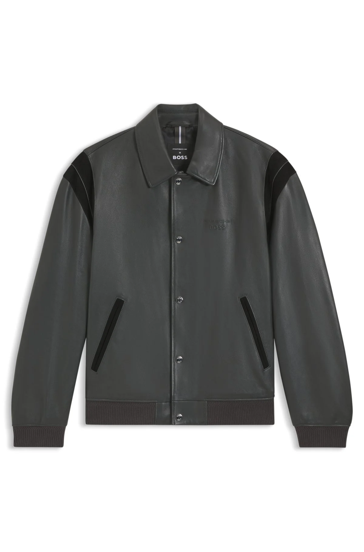 SIZE AND FIT The model wears a size 38R and is 6'1" tall with a, 36" chest, 29" waist and 37" hips. DETAILS Meon_PS - 50543223 Celebrating a Porsche icon, this Porsche x BOSS leather jacket is emblazoned with a Targa logo across the back. Easy regular fit. Contrast stripes. Part of the Porsche x BOSS capsule, a collection of bold styles that captures the BOSS attitude of drive and determination. Regular fit Shirt Collar Fastening top: Zip and button closure Number of buttons: 4 or more buttons Pockets top: Welt pockets Inside zip pockets Ribbed cuffs Fully lined Standard length Fit back length: 66 cm (26 inches) QUALITY & CARE INSTRUCTIONS Do Not Tumble Dry Reduced Dry Clean Quality: 100% Lamb leather, Lining: 100% Polyester, Facing: 100% Lamb leather, Knitwear: 98% Cotton, 2% Elastane Do Not Wash Do Not Bleach Do Not Iron