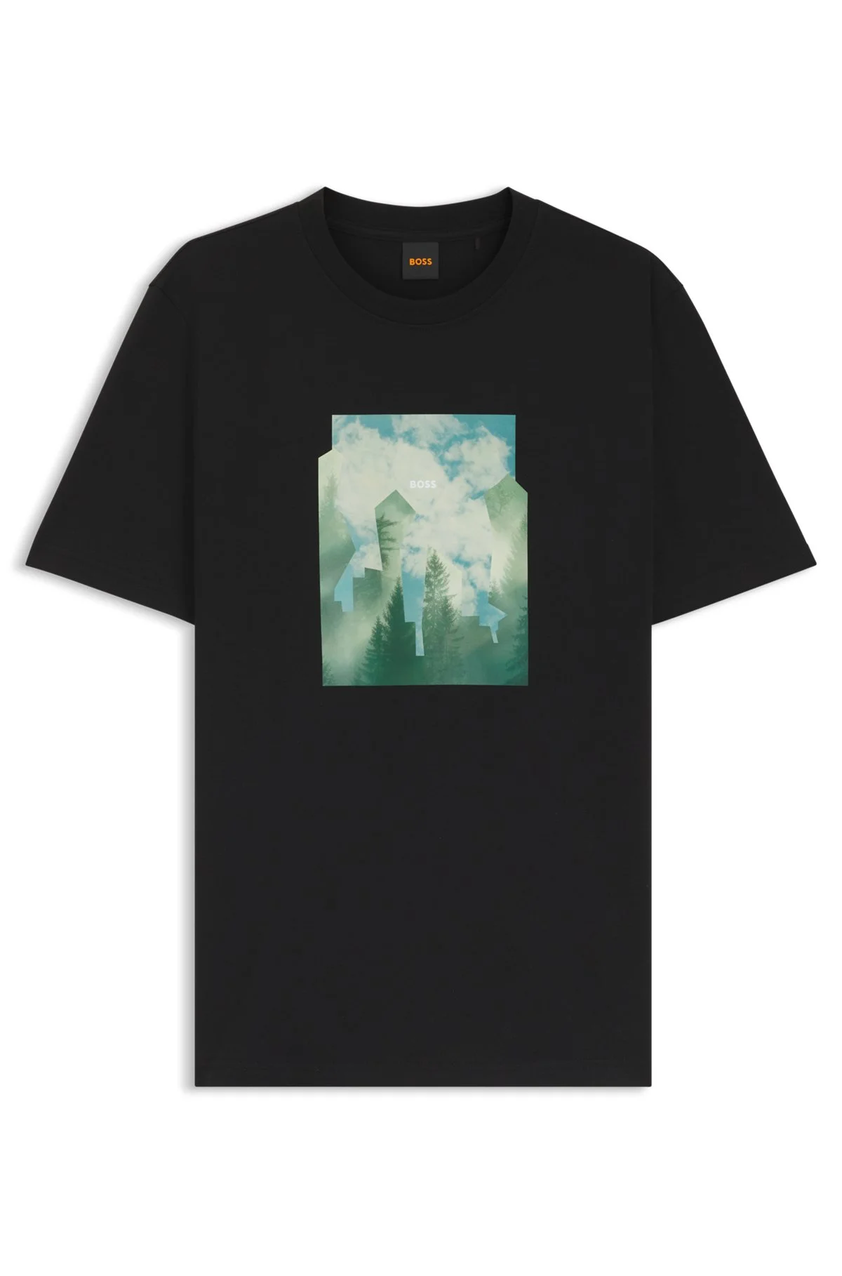 SIZE AND FIT The model wears a size L and is 6'2" tall with a, 38" chest, 31" waist and 38" hips. DETAILS Upgrade your casual look with the printed artwork of this BOSS Menswear T-shirt. Cut to a regular fit in soft, breathable cotton. Regular fit Neckline: Crew neck Short sleeves Te_Cover - 50556024 QUALITY & CARE INSTRUCTIONS Machine Wash Cold Gentle Iron Low Heat Do Not Tumble Dry Material: 100% Cotton Do Not Dry Clean Do Not Bleach