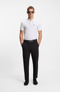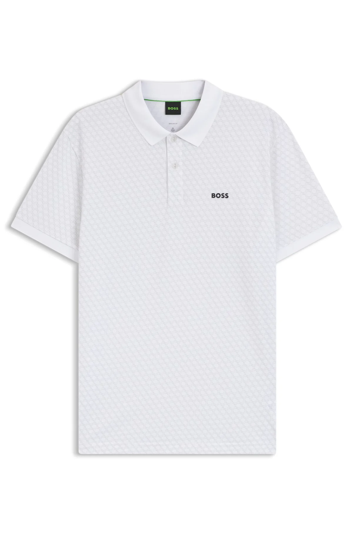 SIZE AND FIT The model wears a size M and is 6'2" tall with a, 38" chest, 29" waist and 38" hips. DETAILS Cut in quick-dry pique made from 100% cotton, this printed BOSS Menswear polo shirt is a dynamic choice. Four-way stretch. Regular fit Regular fit Neckline: Flat-knit collar Number of buttons: 2 Short sleeves Flat-knit cuffs Standard length PL_GOC Chip Pattern - 50554591 QUALITY & CARE INSTRUCTIONS Material: 100% Cotton Machine Wash Cold Gentle Do Not Bleach Do Not Tumble Dry Do Not Dry Clean Iron Low Heat