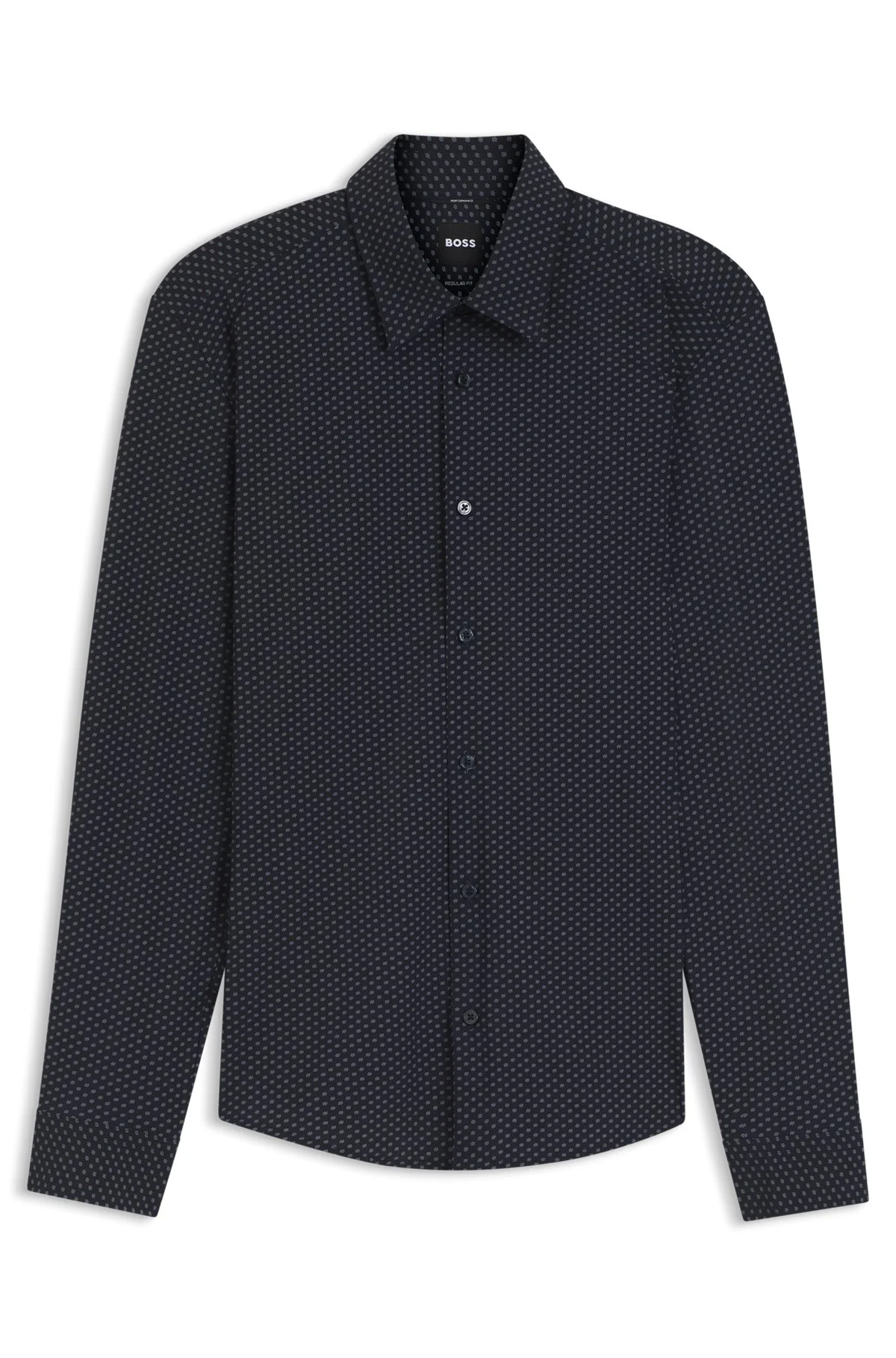 SIZE AND FIT Regular fit The model wears a size M and is 6'1" tall with a, 37" chest, 29" waist and 35" hips. DETAILS Cut to an easy regular fit, this BOSS Menswear shirt is printed with a modern motif. Crafted in performance-stretch jersey for freedom of movement. Regular fit Kentkragen Round cuffs Standard length P-LIAM-K-F-261 - 50562148 QUALITY & CARE INSTRUCTIONS Material: 76% Polyamid, 24% Elastane Do Not Tumble Dry Iron Low Heat Machine Wash Cold Gentle Do Not Bleach Dry Clean Only