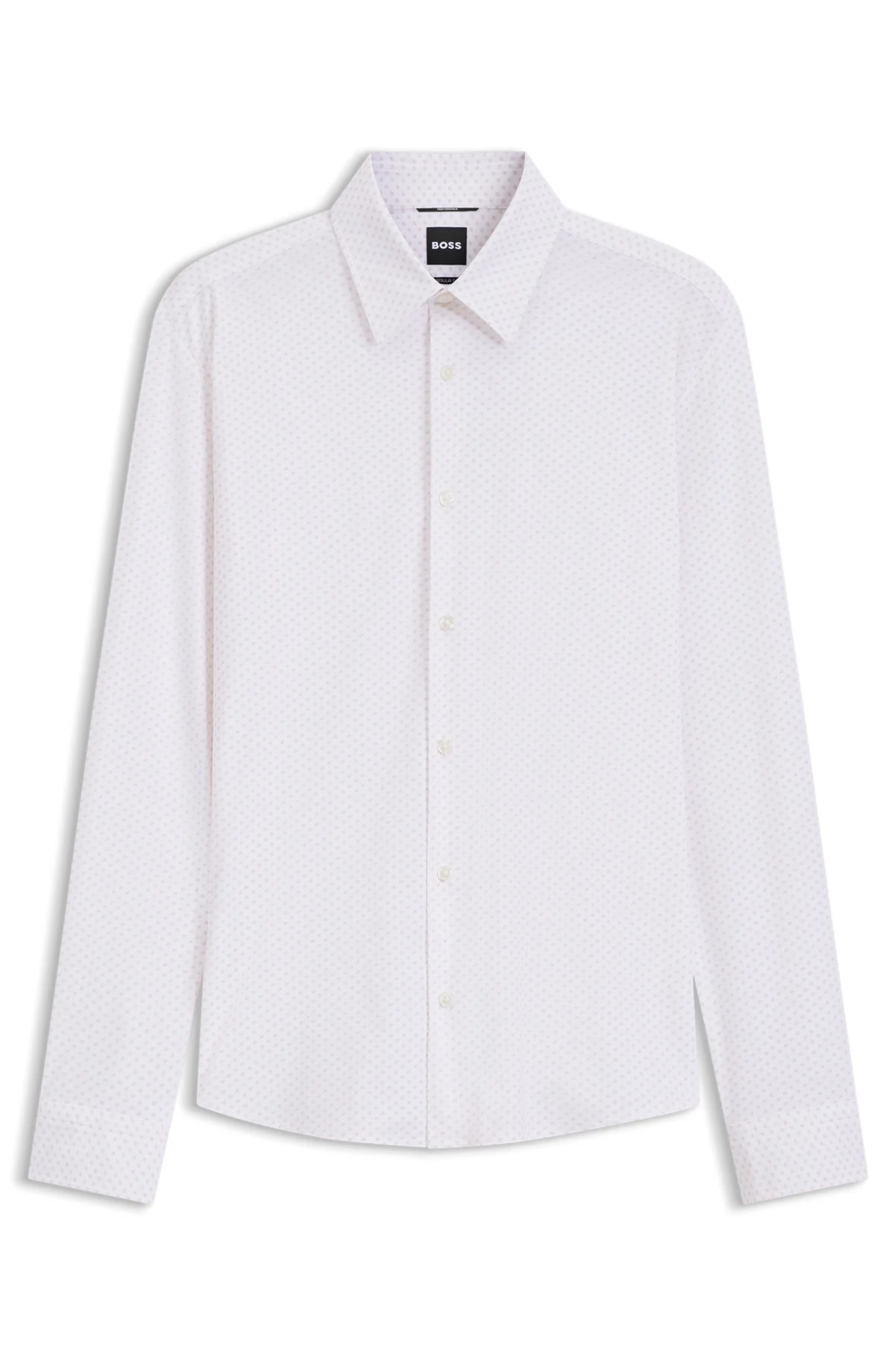 SIZE AND FIT Regular fit The model wears a size M and is 6'1" tall with a, 37" chest, 29" waist and 35" hips. DETAILS Cut to an easy regular fit, this BOSS Menswear shirt is printed with a modern motif. Crafted in performance-stretch jersey for freedom of movement. Regular fit Kentkragen Round cuffs Standard length P-LIAM-K-F-261 - 50562148 QUALITY & CARE INSTRUCTIONS Material: 76% Polyamid, 24% Elastane Do Not Tumble Dry Iron Low Heat Machine Wash Cold Gentle Do Not Bleach Dry Clean Only