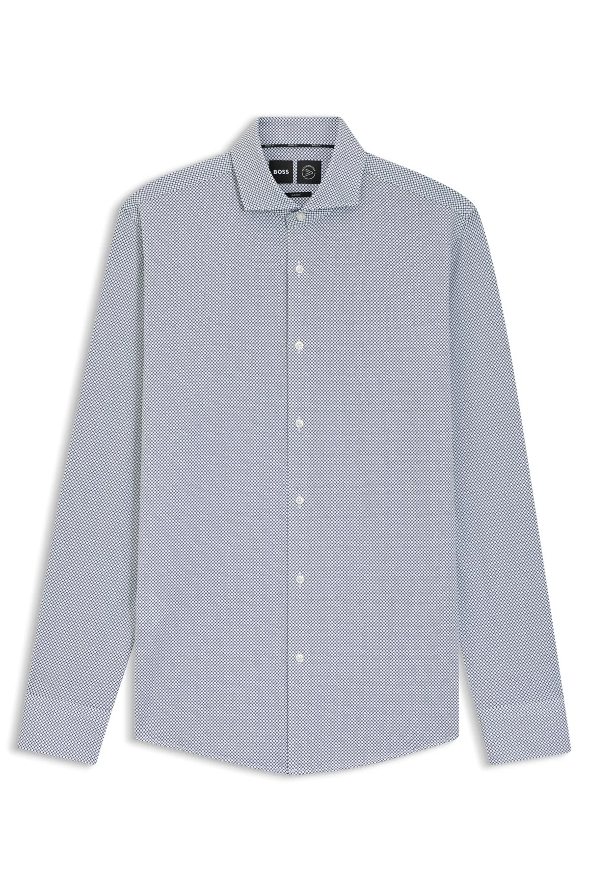 DETAILS Offering advanced stretch and moisture management, this BOSS Menswear shirt deftly balances form and function. Clean slim fit with a modern print. Slim fit Spread collar Round cuffs P-HANK-spread-C1-222 - 50550062 QUALITY & CARE INSTRUCTIONS Machine Wash Cold Gentle Dry Clean Only Do Not Bleach Iron Low Heat Material: 87% Polyamide, 13% Elastane Do Not Tumble Dry