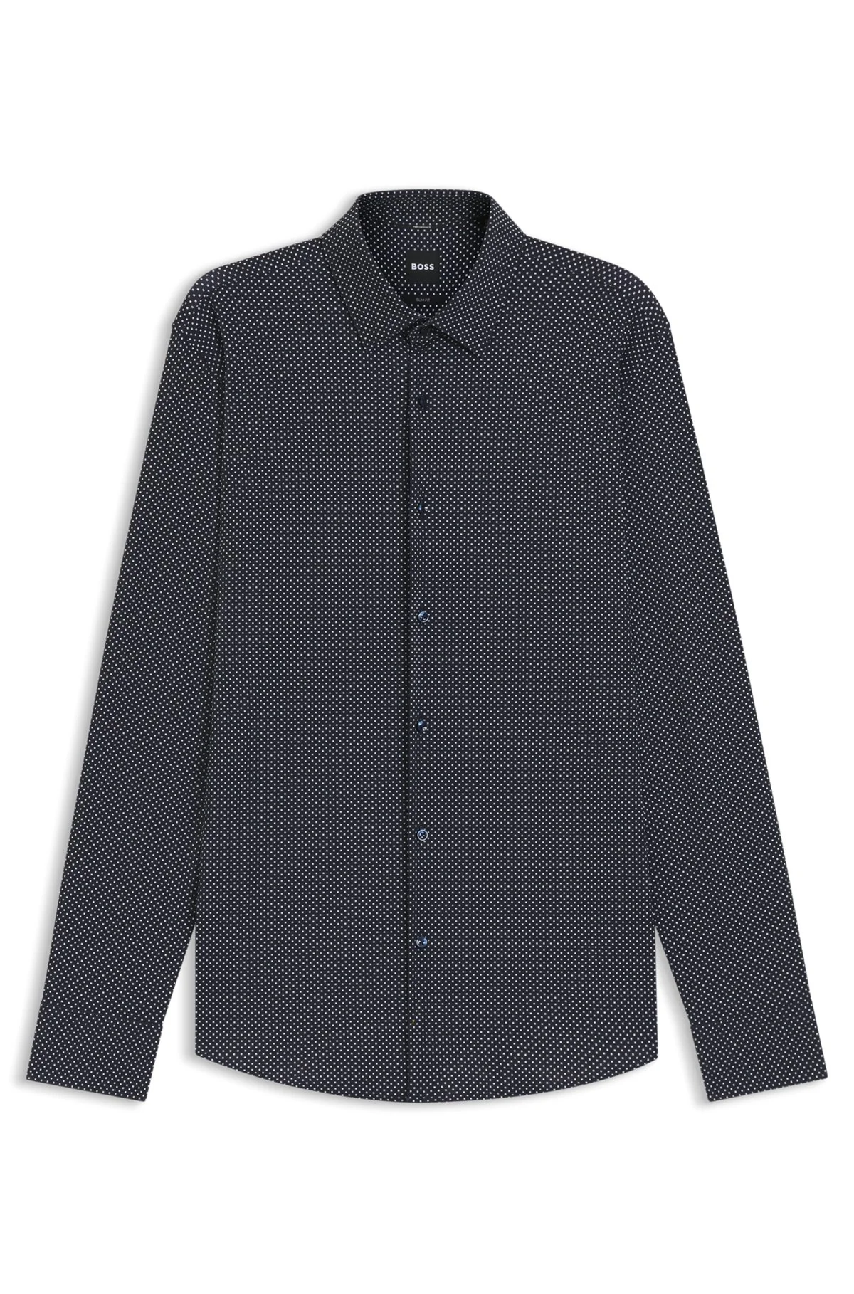 SIZE AND FIT The model wears a size EU:40 and is 6'1" tall with a, 37" chest, 29" waist and 35" hips. DETAILS Update your business collection with the modern print and super-flex jersey of this BOSS Menswear shirt. Tailored to a slim fit. Slim fit Kentkragen Round cuffs P-HANK-S-K-261 - 50556692 QUALITY & CARE INSTRUCTIONS Do Not Tumble Dry Machine Wash Cold Gentle Dry Clean Only Material: 76% Polyamid, 24% Elastane Iron Low Heat Do Not Bleach