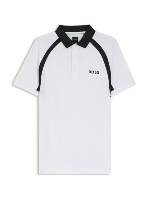 SIZE AND FIT The model wears a size M and is 6'2" tall with a, 38" chest, 30" waist and 37" hips. DETAILS With contrast inserts and a logo detail, this slim-fit BOSS Menswear polo shirt combines style and function. Moisture-managing fabric with four-way stretch. Slim fit Neckline: Flat-knit collar Number of buttons: 3 Short sleeves Flat-knit cuffs Side slit Standard length PL_TOC Spin CB - 50554552 QUALITY & CARE INSTRUCTIONS Machine Wash Cold Gentle Iron Low Heat Do Not Tumble Dry Do Not Dry Clean Do Not Bleach Material: 100% Polyester (97% recycled)