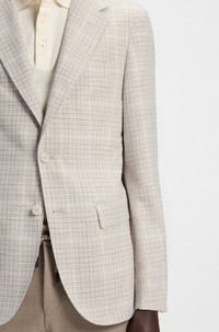 SIZE AND FIT The model wears a size 38R and is 6'1" tall with a, 33" chest, 31" waist and 33" hips. DETAILS L-Jeff-FP-253 - 50545416 Patterned with a classic check, this BOSS Menswear blazer is blended with wool, silk, cotton and stretch for refined comfort. Easy regular fit. Regular fit Unlined Fit back length: 74 cm (29 inches) QUALITY & CARE INSTRUCTIONS Do Not Tumble Dry Reduced Dry Clean Quality: 48% Virgin wool, 24% Silk, 20% Cotton, 5% Polyamid, 3% Elastane, Lining: 100% Cupro Iron Low Heat Do Not Wash Do Not Bleach