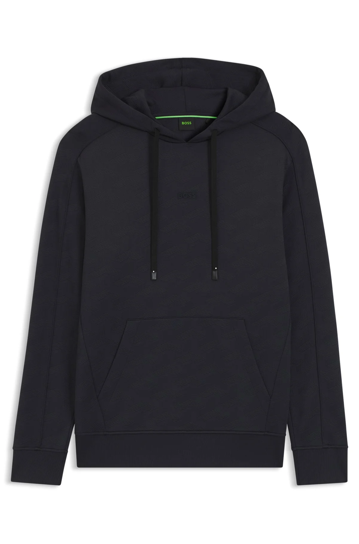 SIZE AND FIT The model wears a size M and is 6'0" tall with a, 38" chest, 30" waist and 37" hips. DETAILS SW_Mirror Hoodie - 50549721 With tonal piping and branding, this BOSS Menswear hoodie features a carbonized quilted jacquard for dynamic style. Regular fit. Wide cords with dipped tips. Regular fit Neckline: Hooded Long sleeves Flat-knit cuffs Standard length QUALITY & CARE INSTRUCTIONS Iron Low Heat Machine Wash Cold Gentle Do Not Tumble Dry Do Not Dry Clean Quality: 99% Polyester, 1% Elastane Do Not Bleach