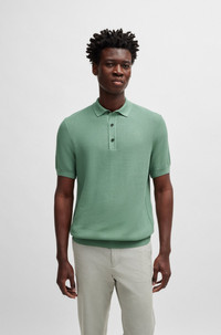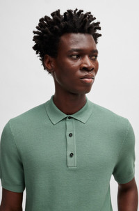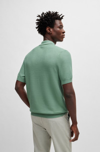 SIZE AND FIT The model wears a size M and is 6'2" tall with a, 37" chest, 29" waist and 35" hips. DETAILS H-Daremo - 50519615 A short-sleeved sweater, with a polo collar, by BOSS Menswear. Knitted with mixed structures, this piece is blended with cotton for a breathable feel. Regular fit Neckline: Polo collar Short sleeves Standard length QUALITY & CARE INSTRUCTIONS Dry Clean Only Iron Medium Heat Do Not Bleach Cold, gentle machine wash; reduced spin speed. Quality: 50% Cotton, 50% Lyocell Do Not Tumble Dry