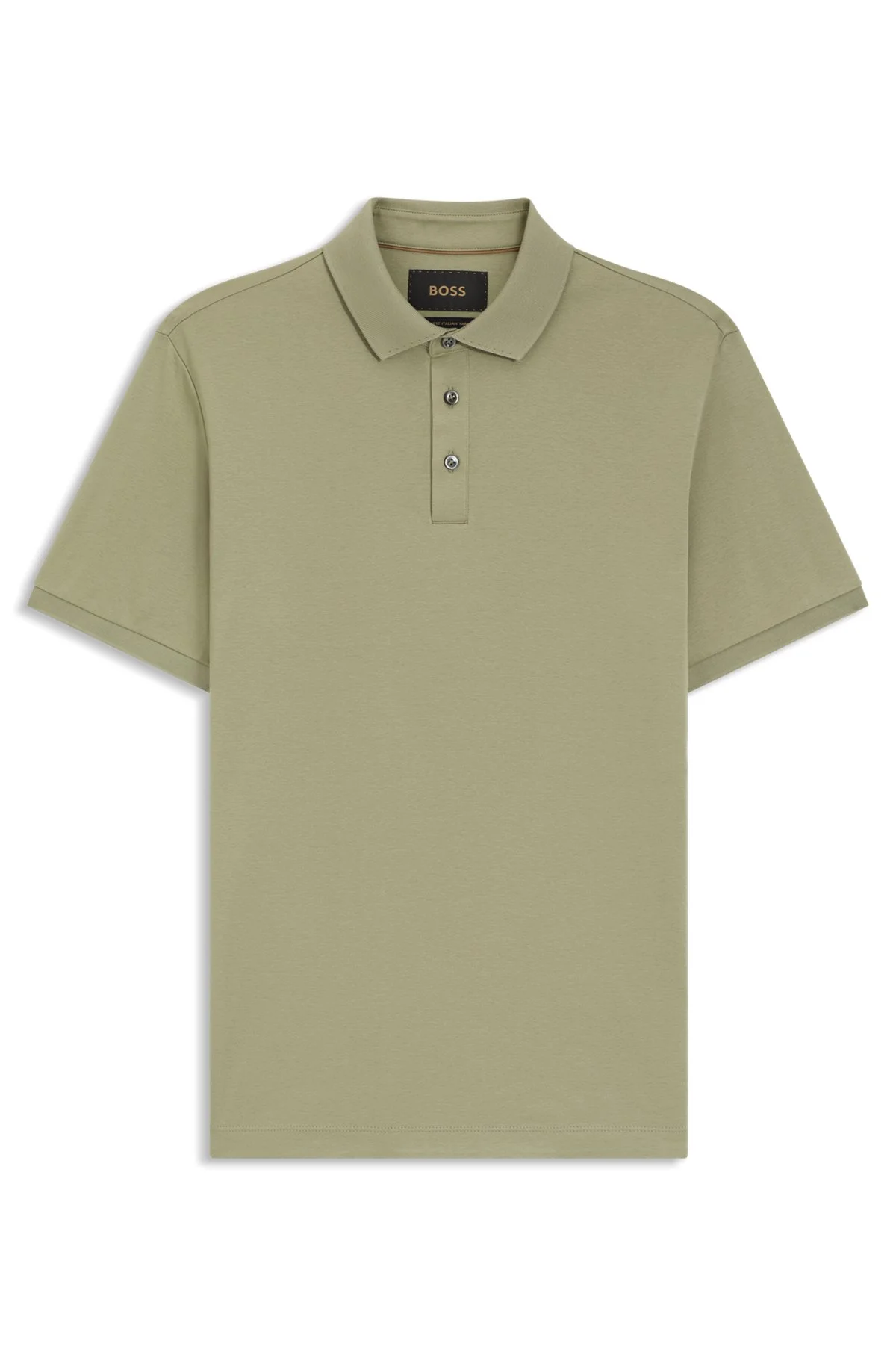 SIZE AND FIT The model wears a size M and is 6'1" tall with a, 36" chest, 29" waist and 36" hips. DETAILS L-Perry 14 - 50494980 A refined polo shirt by BOSS Menswear, cut to a regular fit in mercerized Italian cotton and trimmed with mother-of-pearl buttons. Regular fit Neckline: Flat-knit collar Number of buttons: 3 Short sleeves Flat-knit cuffs Standard length QUALITY & CARE INSTRUCTIONS Reduced Dry Clean Do Not Bleach Cold, gentle machine wash; reduced spin speed. Do Not Tumble Dry Quality: 100% Cotton Iron Low Heat