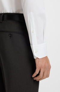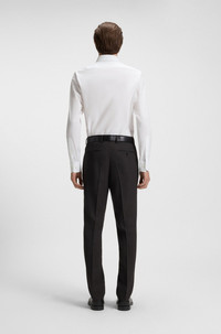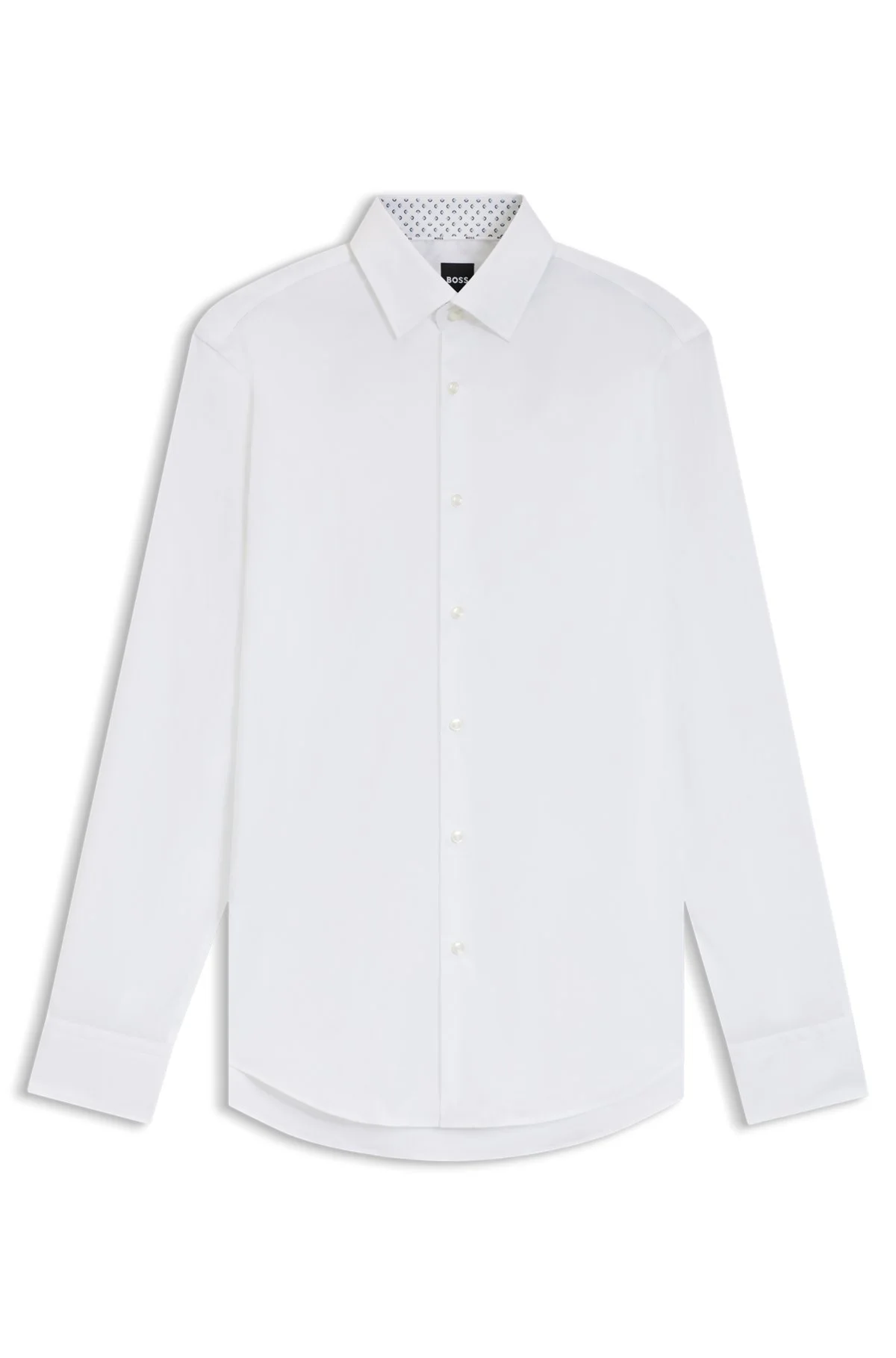 DETAILS In stretch-cotton poplin, this regular BOSS Menswear shirt is simple to style for formal moments. Easy-iron finish with an extra-soft touch. Regular fit Kentkragen Angled cuffs H-JOE-kent-C3-214 - 50549923 QUALITY & CARE INSTRUCTIONS Iron Medium Heat Material: 96% Cotton, 4% Elastane Do Not Tumble Dry Do Not Bleach Machine Wash Warm Dry Clean Only