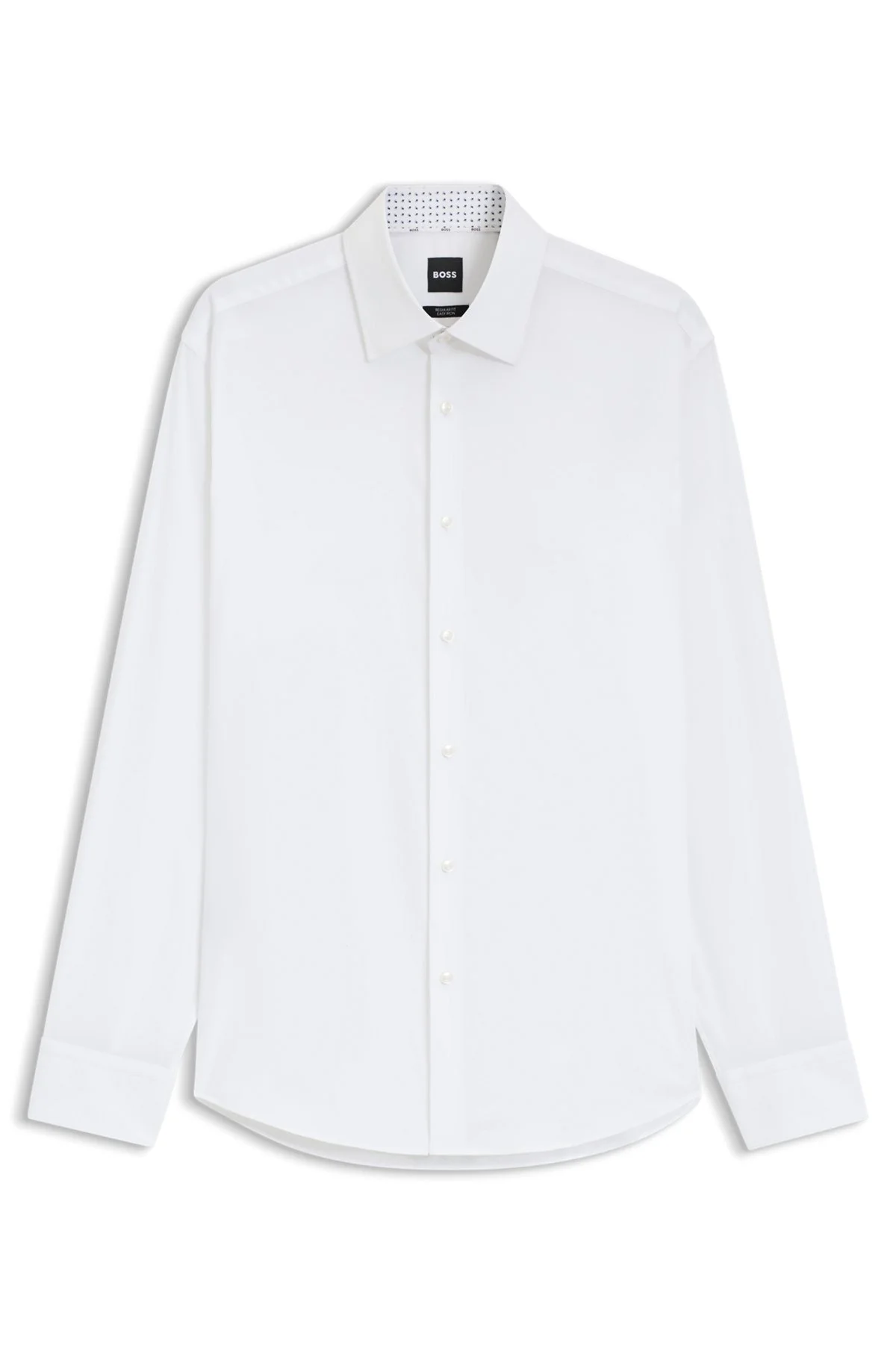 SIZE AND FIT The model wears a size EU:40 and is 6'2" tall with a, 37" chest, 33" waist and 35" hips. DETAILS H-JOE-kent-C3-214 - 50545075 Cut to a straight fit, this BOSS Menswear shirt has a special finish for easy care and enhanced skin friendliness. Stretch-cotton poplin for comfort. Regular fit Kent collar Angled cuffs QUALITY & CARE INSTRUCTIONS Iron Medium Heat Machine Wash Warm Do Not Bleach Do Not Tumble Dry Quality: 96% Cotton, 4% Elastane Dry Clean Only