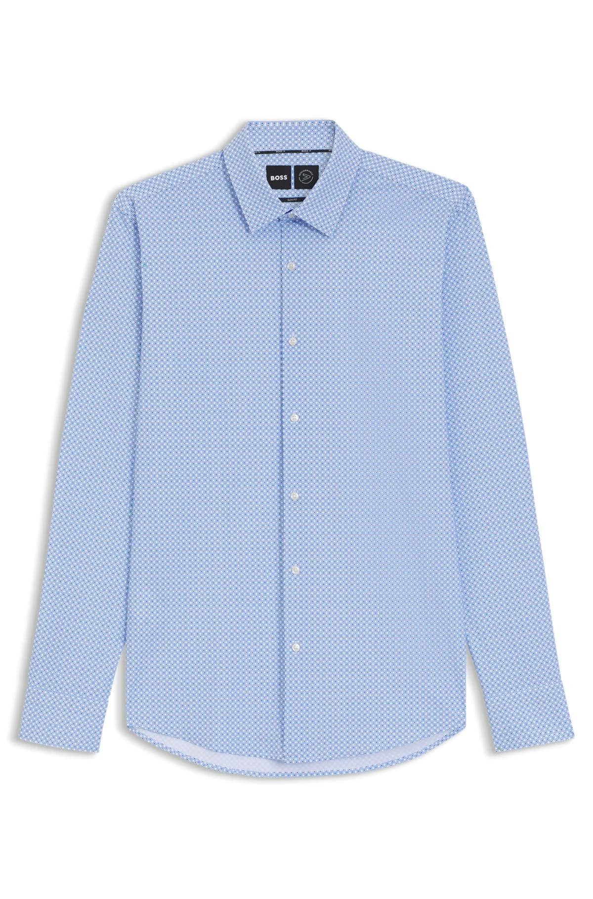 DETAILS P-HANK-s-kent-C1-222 - 50550038 Cut to a clean fit with a modern print, this BOSS Menswear shirt offers advanced comfort thanks to generous stretch. Kent collar Slim fit Kentkragen Round cuffs QUALITY & CARE INSTRUCTIONS Do Not Tumble Dry Machine Wash Cold Gentle Quality: 76% Polyamid, 24% Elastane Iron Low Heat Do Not Bleach Dry Clean Only