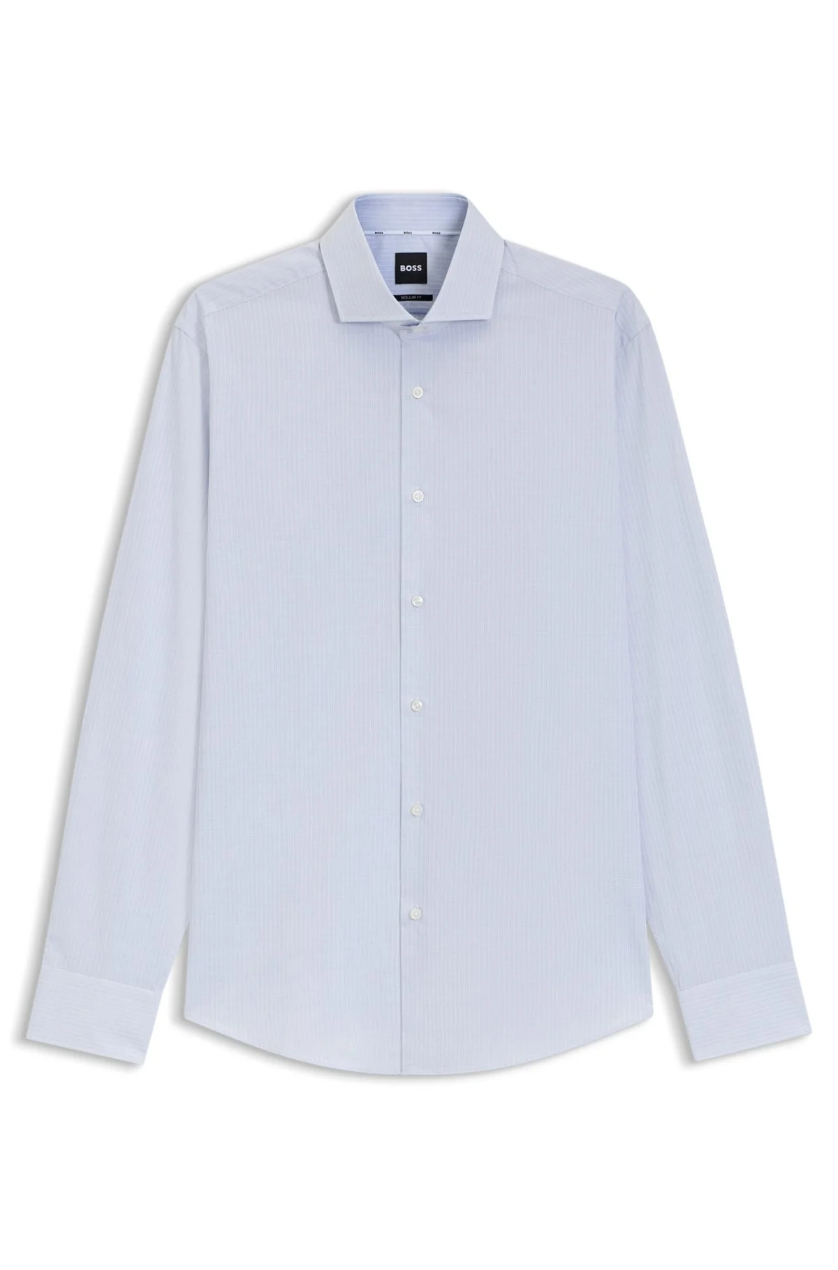 SIZE AND FIT The model wears a size EU:40 and is 6'1" tall with a, 36" chest, 29" waist and 37" hips. DETAILS H-JOE-spread-C1-222 - 50545106 Easy to style for business looks, this BOSS Menswear shirt is made in 100% cotton with a rich structure. Tailored to a regular fit. Regular fit Spread collar Angled cuffs QUALITY & CARE INSTRUCTIONS Iron Medium Heat Quality: 100% Cotton Machine Wash Warm Dry Clean Only Do Not Tumble Dry Do Not Bleach