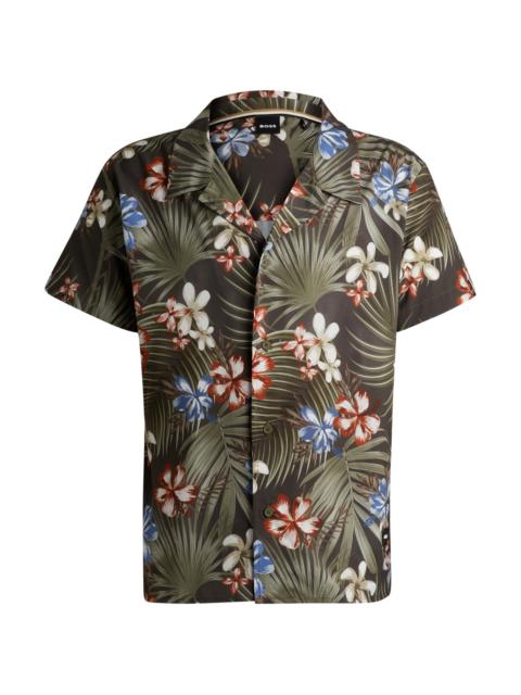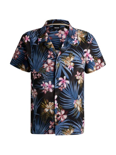 SIZE AND FIT The model wears a size M and is 6'2" tall with a, 38" chest, 29" waist and 36" hips. DETAILS Beach Shirt - 50508958 A beach-ready shirt with a logo-patch trim by BOSS Menswear. This regular-fit piece is printed all over with a seasonal motif. QUALITY & CARE INSTRUCTIONS Iron Low Heat Quality: 100% Polyester Machine Wash Cold Do Not Bleach Do Not Tumble Dry Do Not Dry Clean