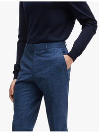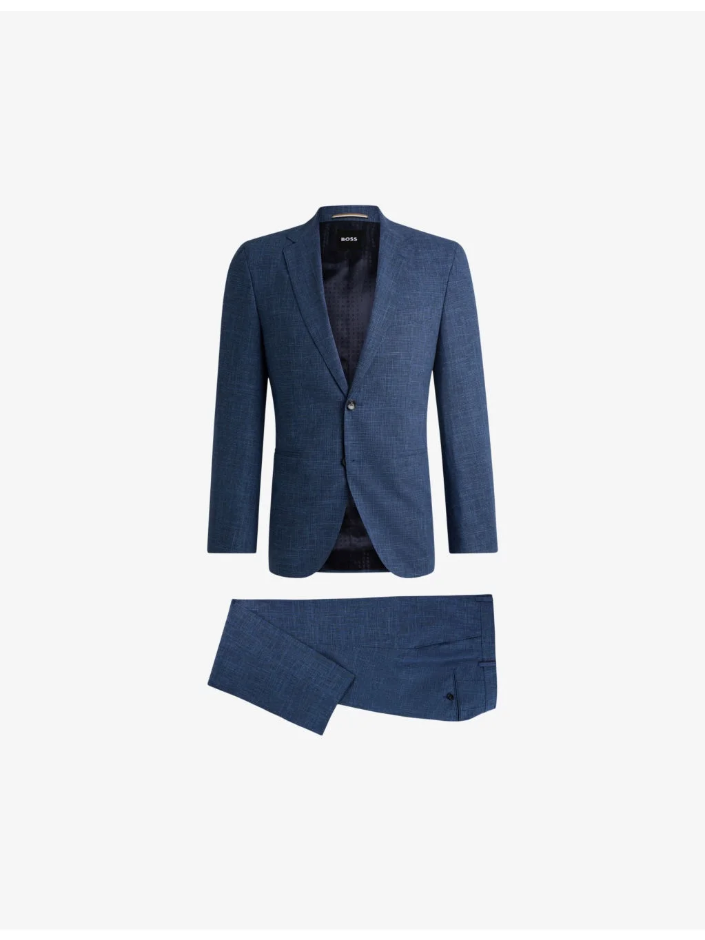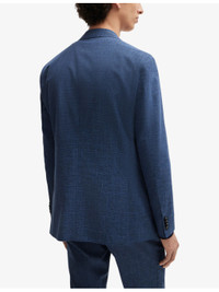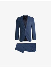PRODUCT DETAILS - BOSS stretch wool-blend suit - 48% virgin wool, 40% cotton, 10% linen, 2% elastane - Exposed button fastening at front - Blazer: regular fit, lapel collar, long sleeves, two pockets at the side, single breasted - Trousers: regular fit, mid-rise, two pockets at the side, straight leg - Dry clean - Model is 6ft 2in/1.88m and wears a size UK 32 - Midweight, slight stretch Ref: R04252653