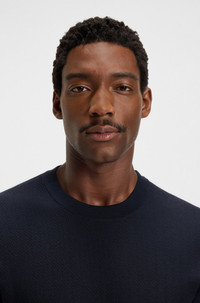 DETAILS L-Illaso - 50543260 With its herringbone knit in cotton-silk yarn, this short-sleeved BOSS Menswear sweater makes an elevated layer. Easy regular fit. Regular fit Neckline: Crew neck Short sleeves Standard length QUALITY & CARE INSTRUCTIONS Dry Clean Only Do Not Bleach Quality: 67% Cotton, 33% Silk Cold, gentle machine wash; reduced spin speed. Iron Medium Heat Do Not Tumble Dry