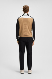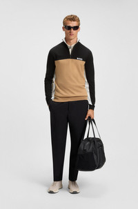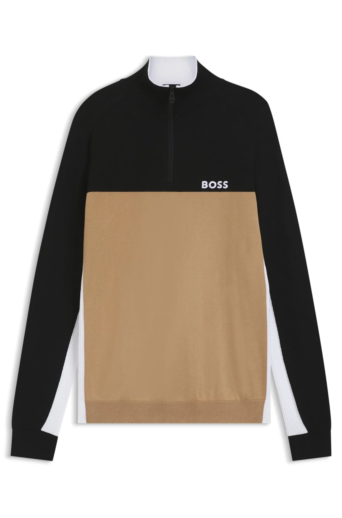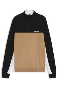 SIZE AND FIT The model wears a size M and is 6'2" tall with a, 36" chest, 31" waist and 38" hips. DETAILS K_Hydro-X_1 - 50528740 A color-blocked sweater with a zip neck by BOSS Menswear. Featuring creative branding front and back, this layer is designed in water-repellent stretch material. Regular fit Neckline: Zip neck Long sleeves Standard length QUALITY & CARE INSTRUCTIONS Quality: 82% Cotton, 17% Polyester, 1% Elastane Machine Wash Cold Gentle Iron Medium Heat Do Not Bleach Do Not Tumble Dry Do Not Dry Clean