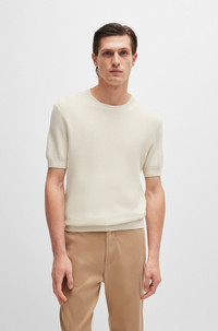 SIZE AND FIT The model wears a size M and is 6'2" tall with a, 35" chest, 29" waist and 35" hips. DETAILS H-Dalon - 50519613 A regular-fit sweater knitted with a rich structure by BOSS Menswear. This short-sleeved piece is blended with cotton and trimmed with a logo flag. Regular fit Neckline: Crew neck Short sleeves Standard length QUALITY & CARE INSTRUCTIONS Cold, gentle machine wash; reduced spin speed. Quality: 50% Cotton, 50% Lyocell Iron Medium Heat Dry Clean Only Do Not Tumble Dry Do Not Bleach