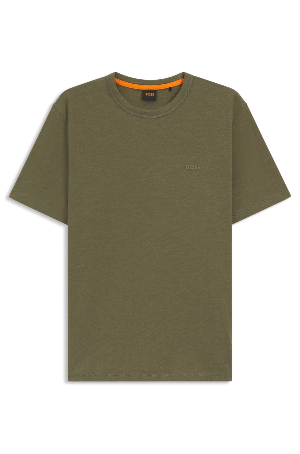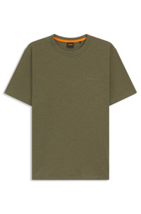 SIZE AND FIT The model wears a size M and is 6'1" tall with a, 35" chest, 27" waist and 36" hips. DETAILS Tegood - 50508243 An essential T-shirt by BOSS Menswear. Featuring a logo at the left chest, this regular-fit top is crafted in soft slub-cotton jersey. Regular fit Neckline: Crew neck Short sleeves QUALITY & CARE INSTRUCTIONS Iron Low Heat Quality: 100% Cotton Do Not Dry Clean Machine Wash Cold Gentle Do Not Tumble Dry Do Not Bleach