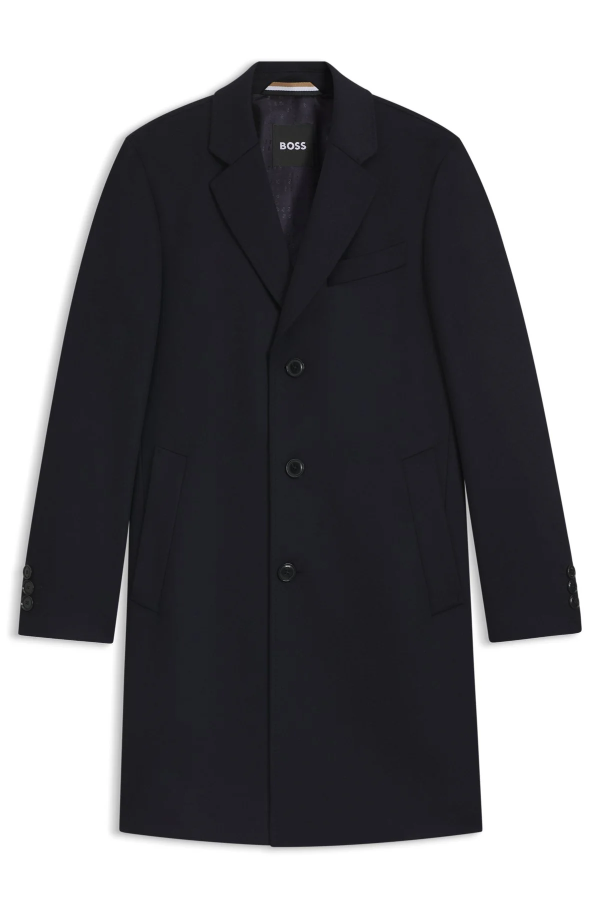DETAILS H-Hyde-254 - 50549187 A timeless option for layering over tailoring, this BOSS Menswear coat is crafted in soft wool blended with luxurious cashmere. Slim fit Notch lapels Slim fit Notched lapels Number of buttons: 3 Welt chest pockets Pockets top: Side-entry pockets Button cuffs Back vent Fully lined QUALITY & CARE INSTRUCTIONS Do Not Tumble Dry Reduced Dry Clean Iron Low Heat Quality: 90% Wool, 10% materialcode.RWS, Sleeve lining: 100% Viscose, Body Lining: 100% Viscose Do Not Wash Do Not Bleach