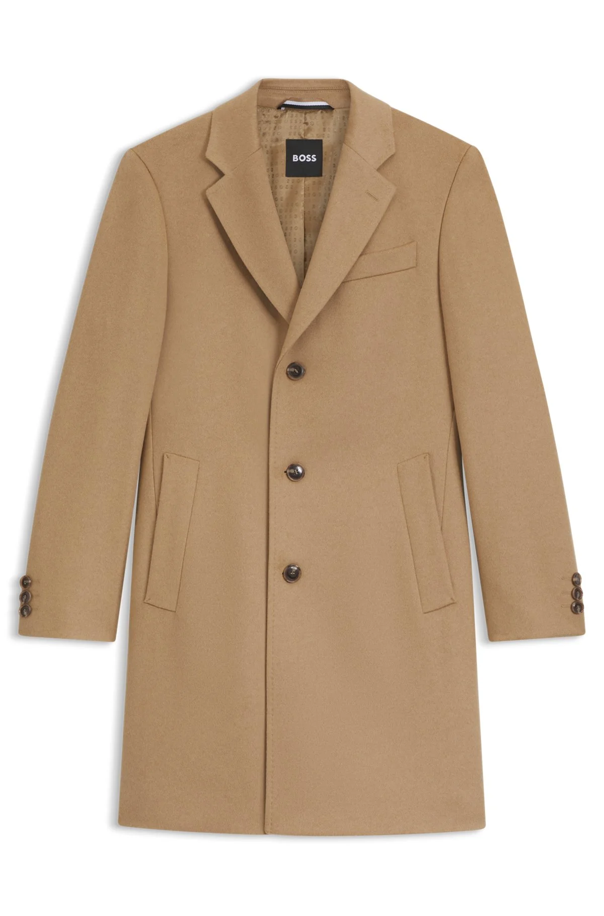 DETAILS H-Hyde-254 - 50549187 A timeless option for layering over tailoring, this BOSS Menswear coat is crafted in soft wool blended with luxurious cashmere. Slim fit Notch lapels Slim fit Notched lapels Number of buttons: 3 Welt chest pockets Pockets top: Side-entry pockets Button cuffs Back vent Fully lined QUALITY & CARE INSTRUCTIONS Do Not Tumble Dry Reduced Dry Clean Iron Low Heat Quality: 90% Wool, 10% materialcode.RWS, Sleeve lining: 100% Viscose, Body Lining: 100% Viscose Do Not Wash Do Not Bleach