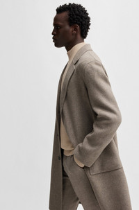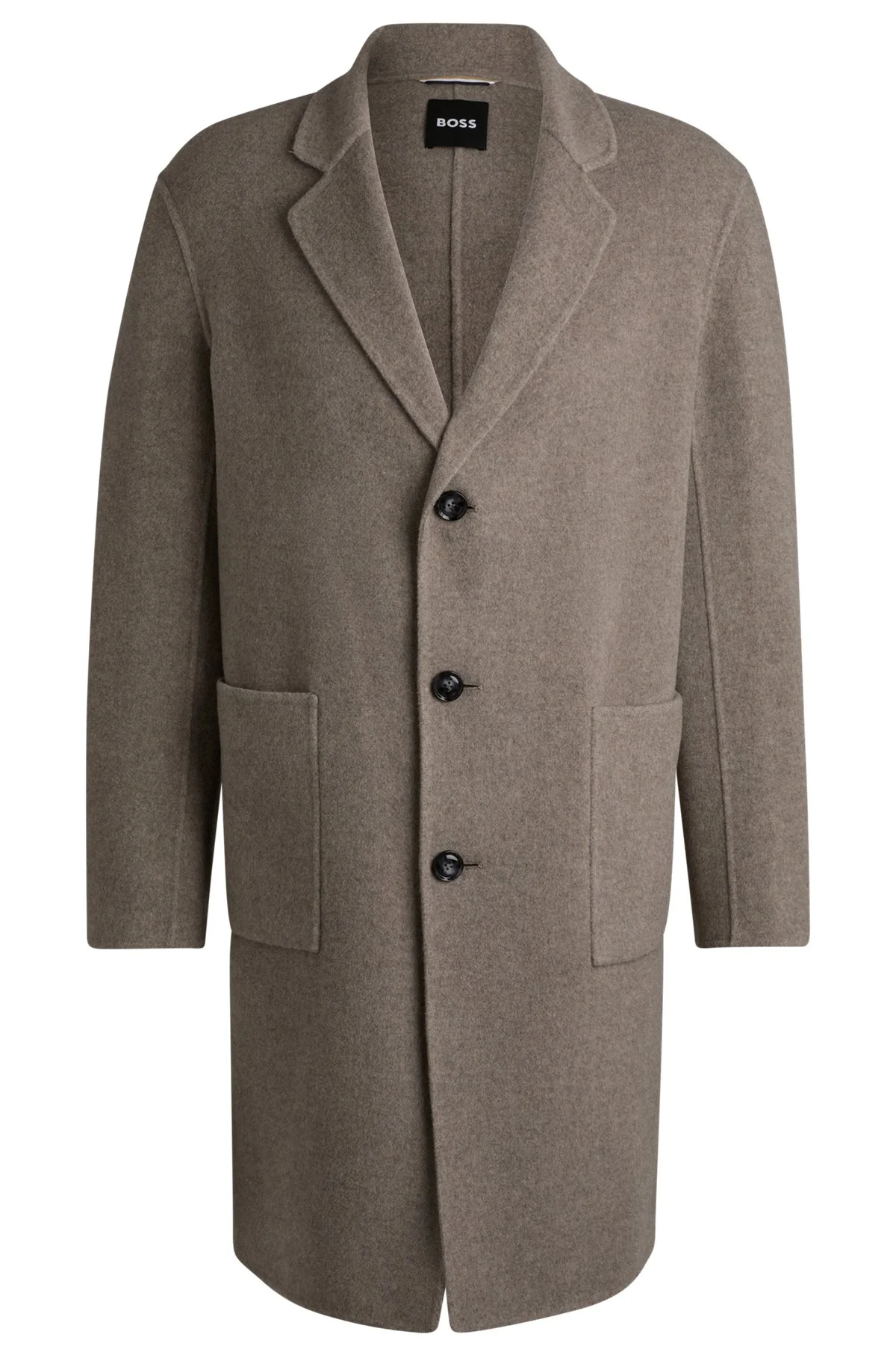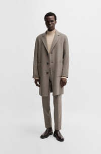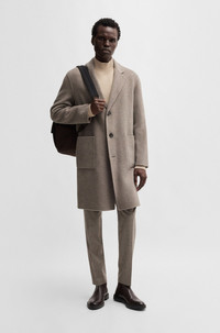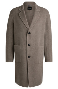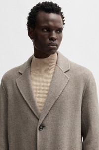 SIZE AND FIT The model wears a size 38R and is 6'1" tall with a, 33" chest, 24" waist and 36" hips. DETAILS C-Cale-DF-244F - 50534208 A modern coat in a double-faced wool blend by BOSS. This piece is cut to a relaxed fit with notch lapels and patch pockets. Unlined Fit back length: 100 cm (39 inches) QUALITY & CARE INSTRUCTIONS Do Not Tumble Dry Do Not Bleach Quality: 70% Wool, 30% Polyamid Do Not Wash Iron Low Heat Reduced Dry Clean