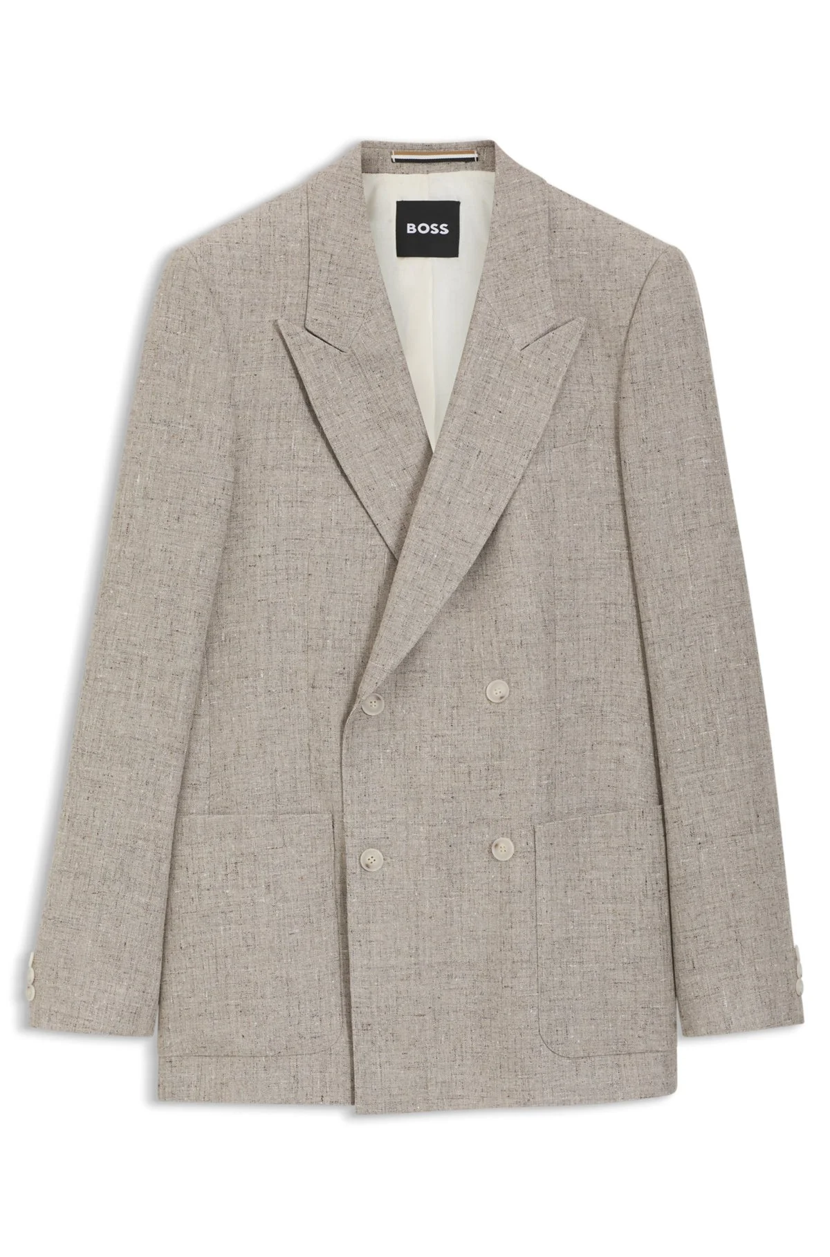 SIZE AND FIT Relaxed fit The model wears a size EU:94 and is 6'1" tall with a, 37" chest, 29" waist and 35" hips. DETAILS A double-breasted suit jacket by BOSS Menswear. Cut to a relaxed fit in micro-patterned fabric blended with linen for breathability. Classic detailing including sharply constructed shoulders and full lining. Matching trousers available. This style was showcased on the BOSS Summer 26 Fashion Show runway in Milan. Relaxed fit Peaked lapels Fastening top: Button closure Number of buttons: Double-breasted Welt chest pockets Pockets top: Patch pockets Kissing buttons on the cuff Back vent Fully lined C-Callum-DB-262 - 50561956 QUALITY & CARE INSTRUCTIONS Do Not Wash Dry Clean Only Do Not Bleach Do Not Tumble Dry Material: 75% Viscose, 25% Linen, Lining: 100% Viscose, Sleeve lining: 100% Viscose Iron Medium Heat