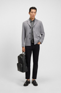 SIZE AND FIT The model wears a size 40L and is 6'2" tall with a, 34" chest, 28" waist and 37" hips. DETAILS P-Carper-Flaps-251 - 50535068 A trend-driven jacket by BOSS Menswear. Cut to a roomy fit, this piece is crafted in bonded fabric blended with wool and comforting stretch. Relaxed fit Notched lapels Number of buttons: 3 Pockets top: Flap pockets QUALITY & CARE INSTRUCTIONS Do Not Tumble Dry Quality: 50% Viscose, 29% Polyester, 18% Wool, 3% Elastane Do Not Bleach Do Not Wash Iron Low Heat Reduced Dry Clean