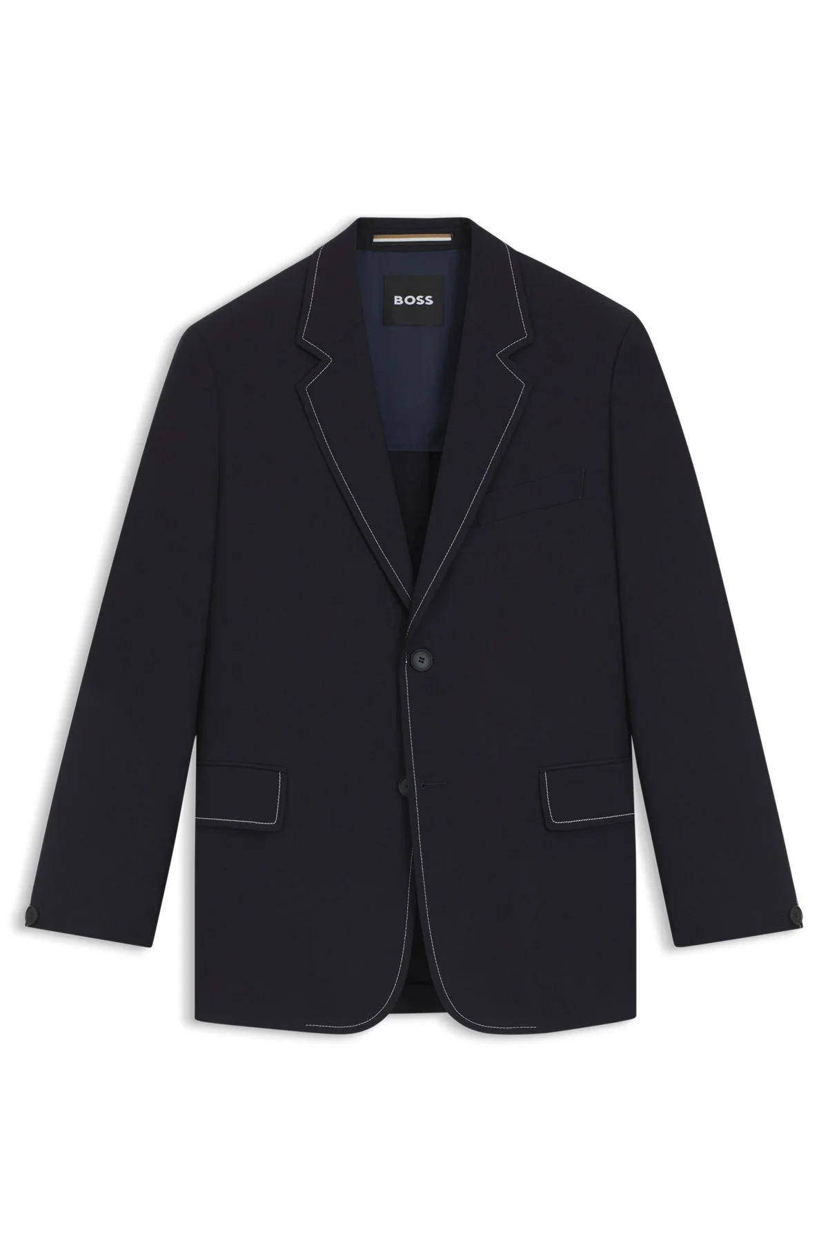 SIZE AND FIT The model wears a size 38R and is 6'1" tall with a, 36" chest, 29" waist and 37" hips. DETAILS C-Cris-CS-253 - 50545808 It's the contrast stitching that gives this BOSS Menswear jacket its contemporary edge. Comfortable relaxed fit with softly constructed shoulders. Trans-seasonal wool poplin. Partially lined QUALITY & CARE INSTRUCTIONS Iron Medium Heat Do Not Wash Do Not Tumble Dry Do Not Bleach Reduced Dry Clean Quality: 100% Virgin wool, Lining: 100% Viscose, Sleeve lining: 100% Viscose