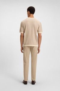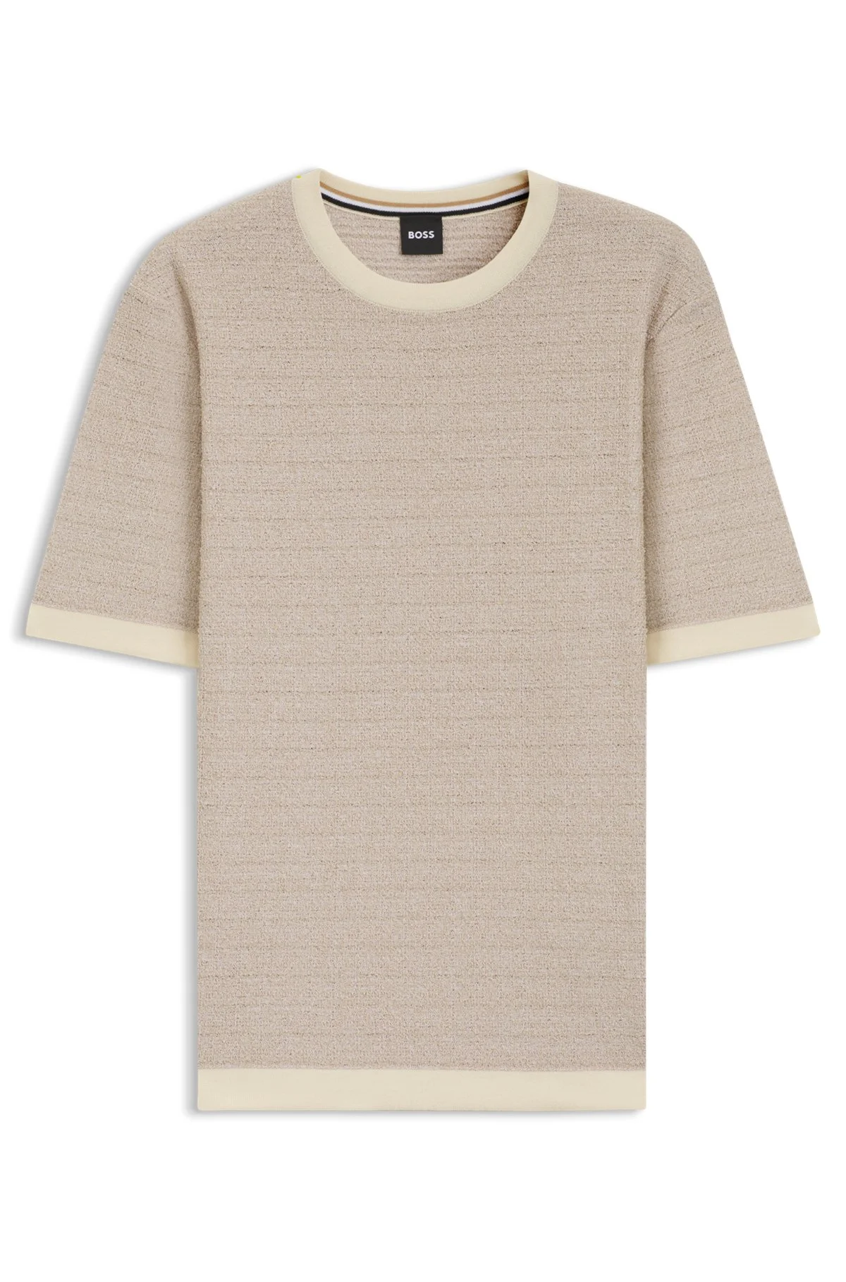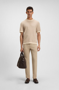 SIZE AND FIT The model wears a size M and is 6'2" tall with a, 34" chest, 26" waist and 35" hips. DETAILS C-Jiordano - 50537662 Offering a fresh take for summer, this BOSS Menswear T-shirt is knitted in lightweight jacquard. Casual relaxed fit. Subtle logo label. This product is partly made with . Our standards do not allow the use of synthetic fertilizers, pesticides or genetically modified seeds. Relaxed fit Neckline: Crew neck Short sleeves Standard length QUALITY & CARE INSTRUCTIONS Cold, gentle machine wash; reduced spin speed. Dry Clean Only Quality: 85% Cotton, 15% Polyamid (12% recycled), Ribbing: 100% Cotton Do Not Tumble Dry Iron Medium Heat Do Not Bleach