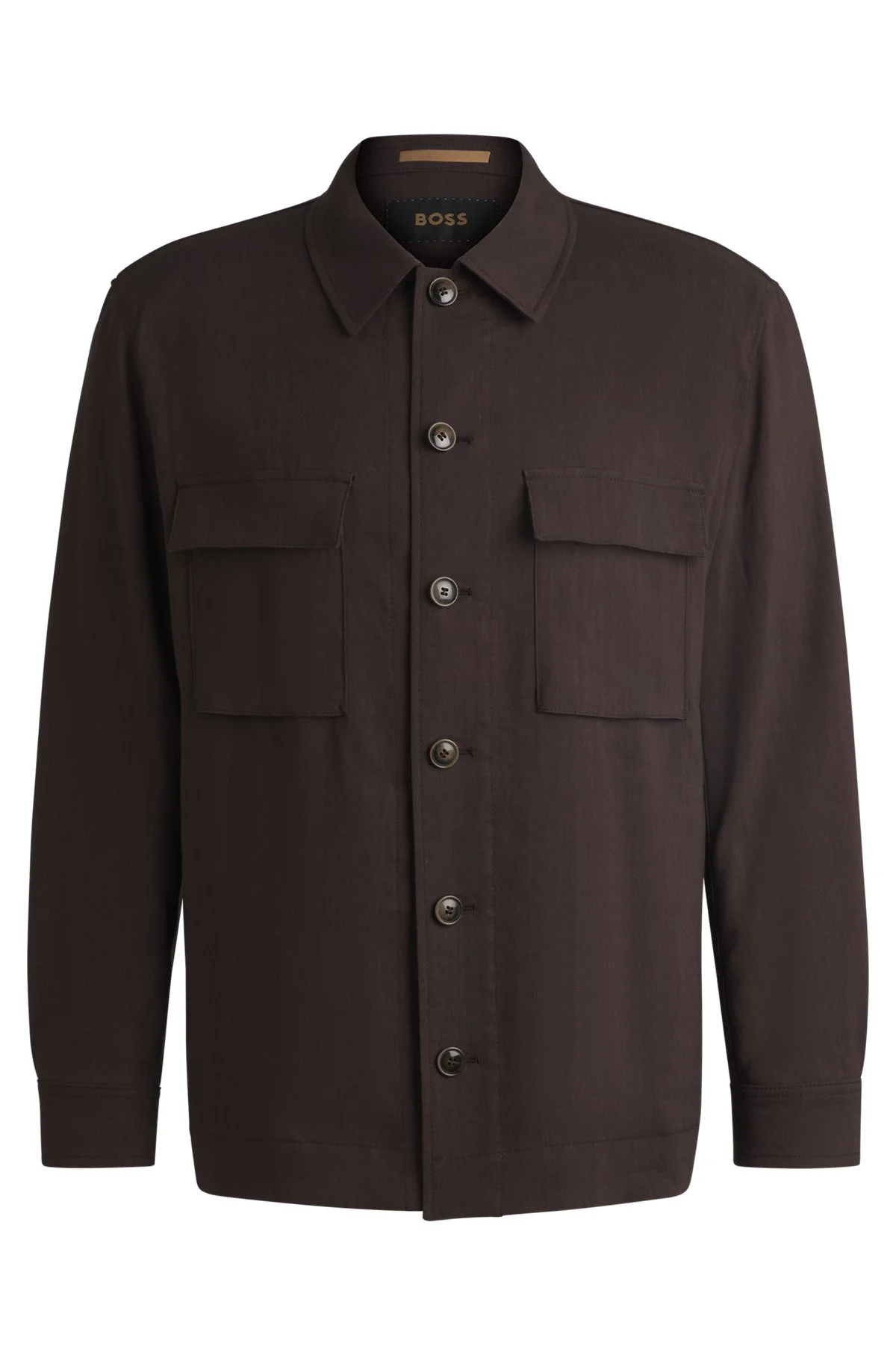 SIZE AND FIT The model wears a size 38R and is 6'2" tall with a, 36" chest, 31" waist and 35" hips. DETAILS L-Corvin-2PP-251 - 50539503 With a roomy fit for summer layering, this BOSS Menswear overshirt is effortlessly refined. Crafted in a breathable linen blend with natural stretch for ease. Unlined QUALITY & CARE INSTRUCTIONS Do Not Wash Do Not Tumble Dry Reduced Dry Clean Iron Medium Heat Do Not Bleach Quality: 53% Linen, 39% Virgin wool, 8% Mohair