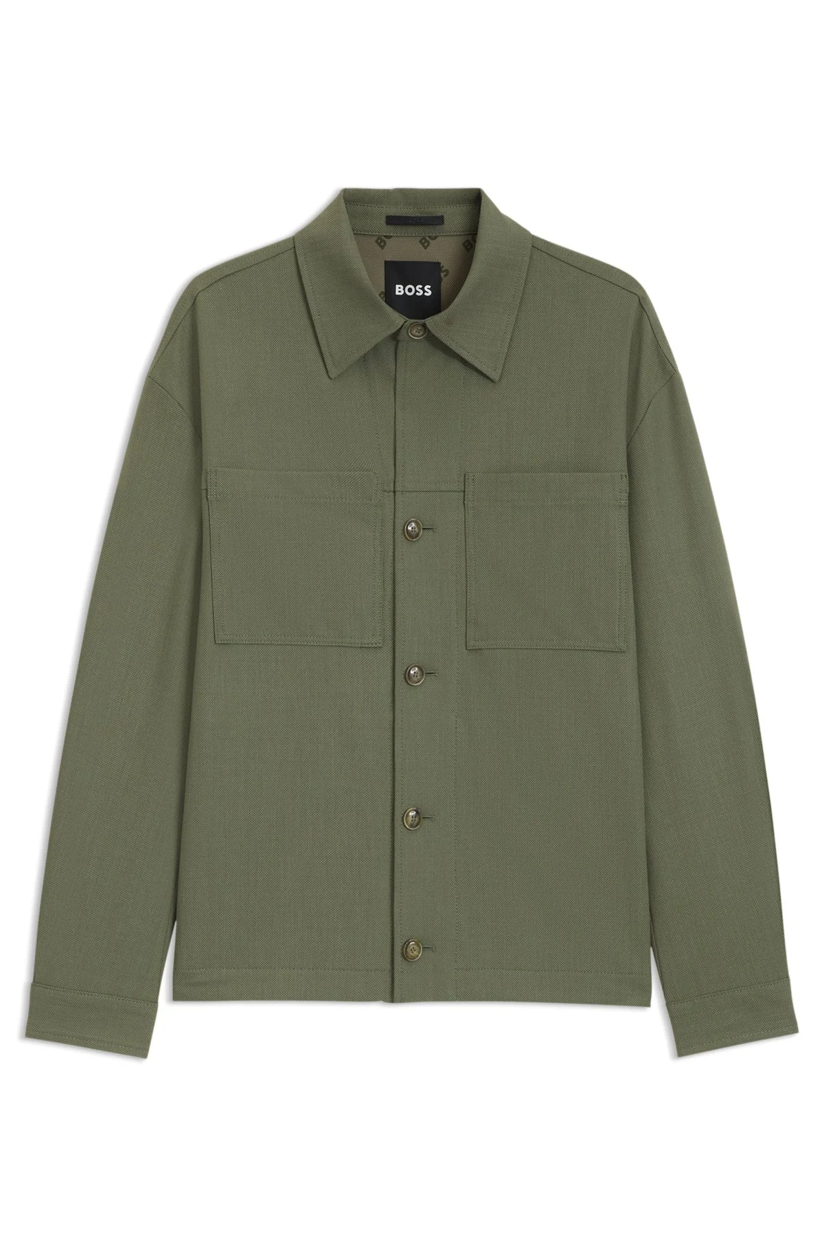 SIZE AND FIT The model wears a size 38R and is 6'2" tall with a, 35" chest, 27" waist and 37" hips. DETAILS P-Craig-WG-253 - 50546059 Crafted in a patterned performance-stretch blend with wool, this BOSS Menswear overshirt is ideal for layering. Relaxed fit Easy-care washable fabric. Patch pockets Relaxed fit Partially lined QUALITY & CARE INSTRUCTIONS Cold, gentle machine wash; reduced spin speed. Do Not Tumble Dry Reduced Dry Clean Quality: 47% Polyester, 29% Wool, 20% Viscose, 4% Elastane, Lining: 60% Polyamid, 40% Polyester, Sleeve lining: 95% Polyester, 5% Elastane Iron Low Heat Do Not Bleach