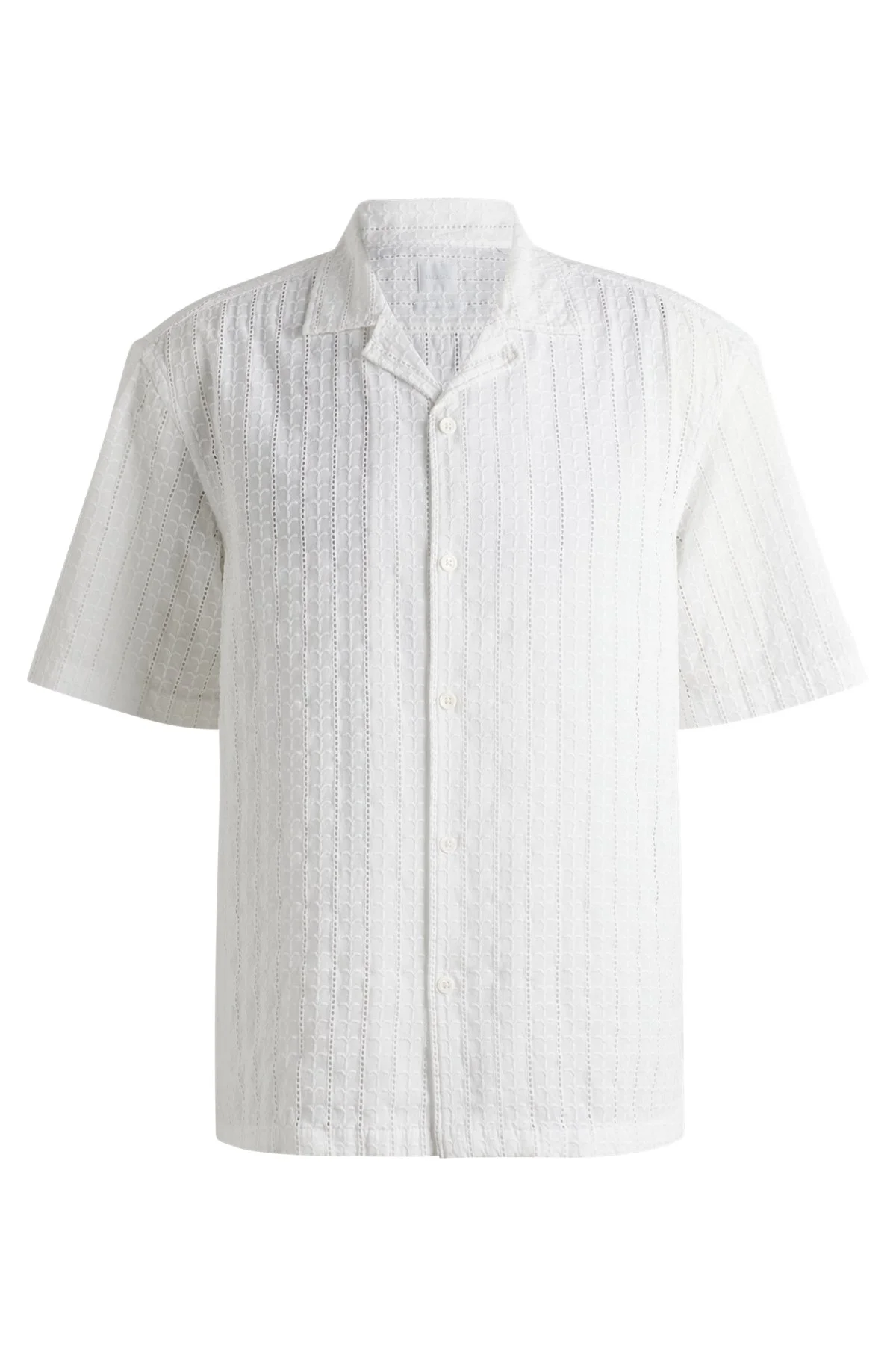 SIZE AND FIT The model wears a size M and is 6'1" tall with a, 36" chest, 28" waist and 36" hips. DETAILS C-LARS-252 - 50539236 Make a fresh statement this summer with the elegant broderie anglaise of this BOSS Menswear shirt. Cut to a laid-back fit in soft cotton. Relaxed fit Camp collar Round cuffs QUALITY & CARE INSTRUCTIONS Do Not Tumble Dry Iron Low Heat Machine Wash Cold Gentle Do Not Bleach Reduced Dry Clean Quality: 100% Cotton