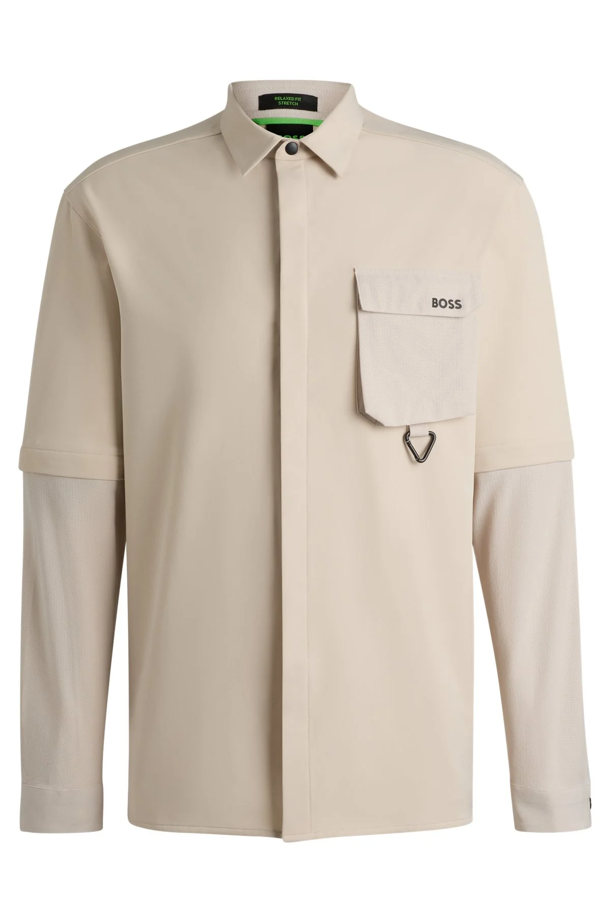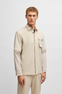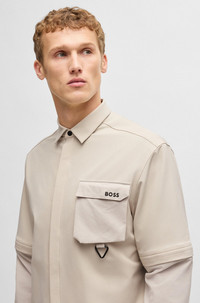 SIZE AND FIT The model wears a size M and is 6'2" tall with a, 36" chest, 31" waist and 38" hips. DETAILS B_Rib_Glamping_L - 50537668 With zip-off sleeves and a carabiner trim on the chest pocket, this BOSS Menswear shirt is a versatile casual option. Water-repellent stretch fabric. Relaxed fit Kent collar Flap chest pockets Barrel cuffs QUALITY & CARE INSTRUCTIONS Do Not Bleach Dry Clean Only Iron Low Heat Quality: 95% Polyester, 5% Elastane Machine Wash Cold Do Not Tumble Dry
