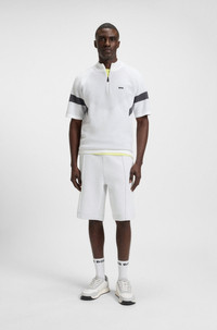 SIZE AND FIT The model wears a size M and is 6'0" tall with a, 36" chest, 31" waist and 35" hips. DETAILS Shorts TL - 50543146 With sporty printed stripes and binding details, these relaxed-fit BOSS Menswear shorts are a dynamic option. V-shape cutlines. Quilted jacquard with cotton. Logo detail. Relaxed fit Regular rise Drawstring Pockets bottom front: Side pockets Pockets bottom back: Welt pocket QUALITY & CARE INSTRUCTIONS Do Not Bleach Quality: 62% Polyester, 38% Cotton Iron Low Heat Do Not Tumble Dry Do Not Dry Clean Machine Wash Cold Gentle
