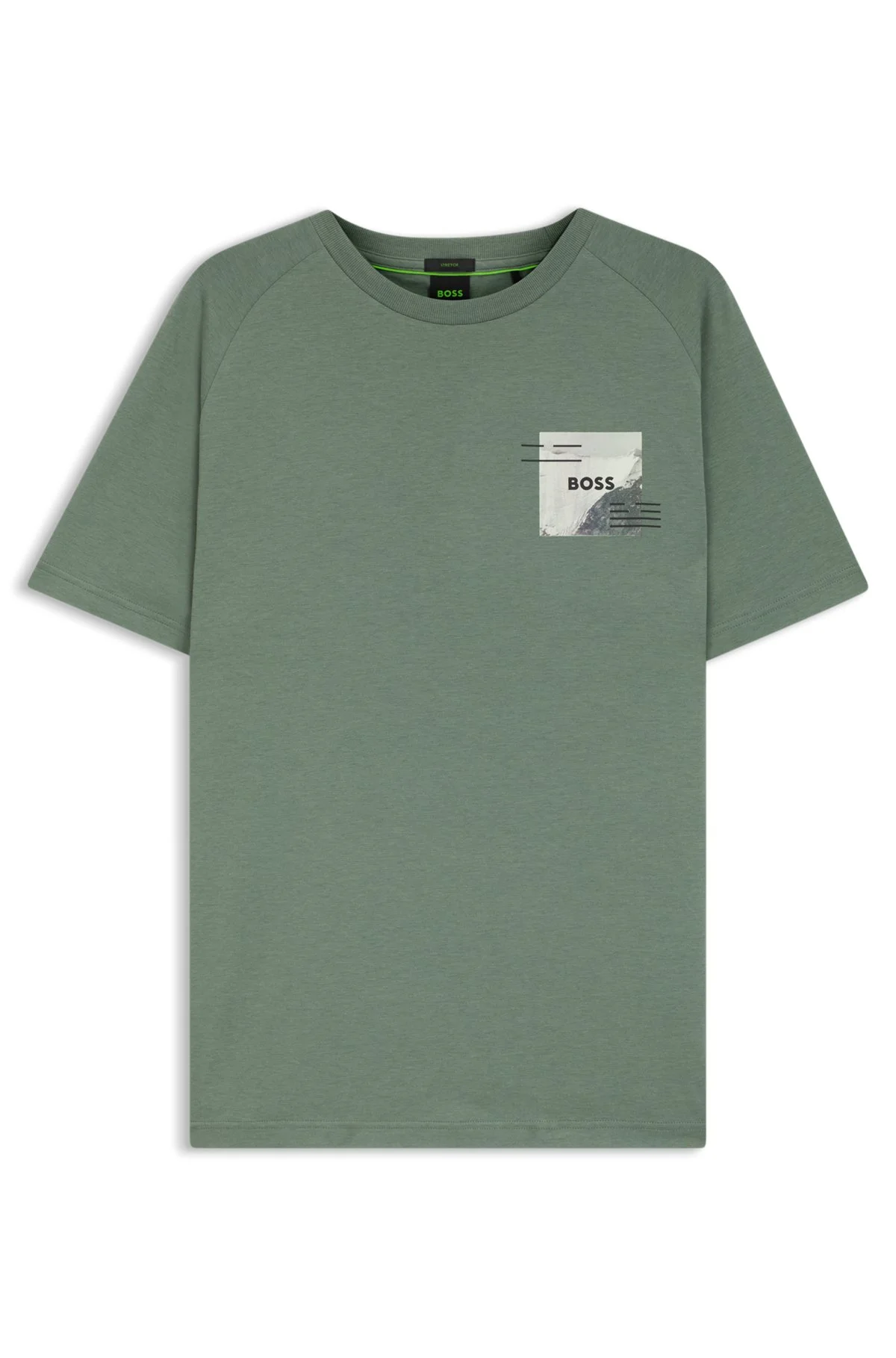 SIZE AND FIT The model wears a size M and is 6'0" tall with a, 38" chest, 29" waist and 38" hips. DETAILS Cut in a stretchy cotton blend, this BOSS Menswear T-shirt makes a fresh statement with photo prints and decorative reflective details. Relaxed fit Logo accent. Relaxed fit Neckline: Crew neck Short sleeves Standard length Tee Stripe Zone - 50548093 QUALITY & CARE INSTRUCTIONS Do Not Tumble Dry Iron Low Heat Do Not Dry Clean Machine Wash Cold Gentle Do Not Bleach Quality: 72% Cotton, 23% Lyocell, 5% Elastane