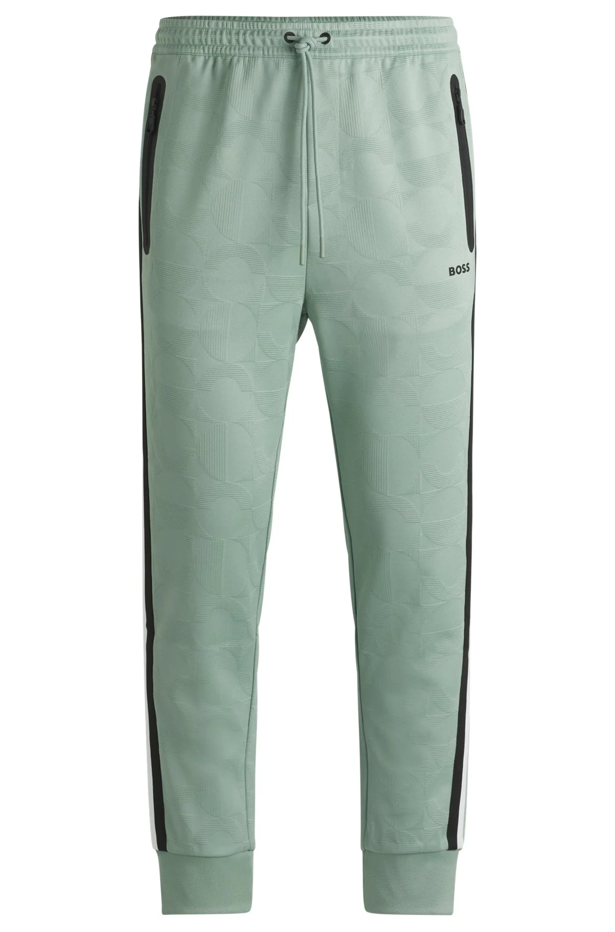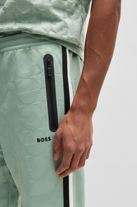 SIZE AND FIT The model wears a size M and is 6'2" tall with a, 34" chest, 28" waist and 33" hips. DETAILS Hover Striped C - 50537373 Featuring zipped pockets and sporty side stripes, these BOSS Menswear tracksuit bottoms have a subtle tonal pattern. Laid-back fit. Adjustable drawstring waist. Relaxed fit Drawstring Pockets bottom front: Side zip pocket Pockets bottom back: Welt pocket QUALITY & CARE INSTRUCTIONS Do Not Dry Clean Do Not Bleach Iron Low Heat Machine Wash Cold Gentle Quality: 98% Polyester, 2% Elastane Do Not Tumble Dry